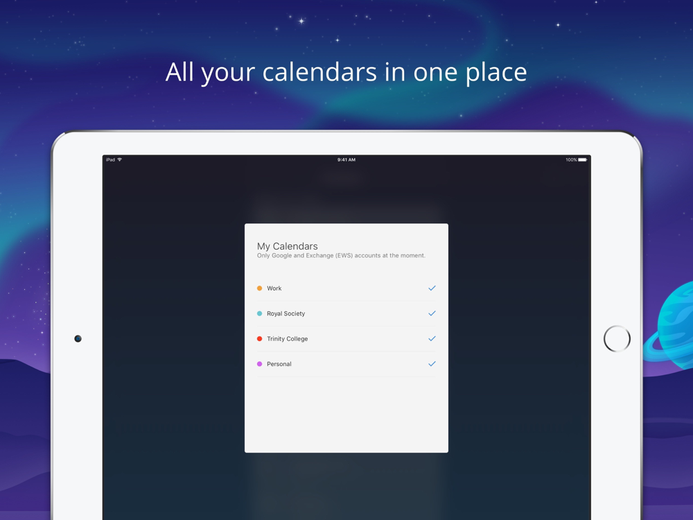 ● Access multiple calendars in one place. Manage any number of Gmail, Google Apps and Exchange (EWS) calendars.