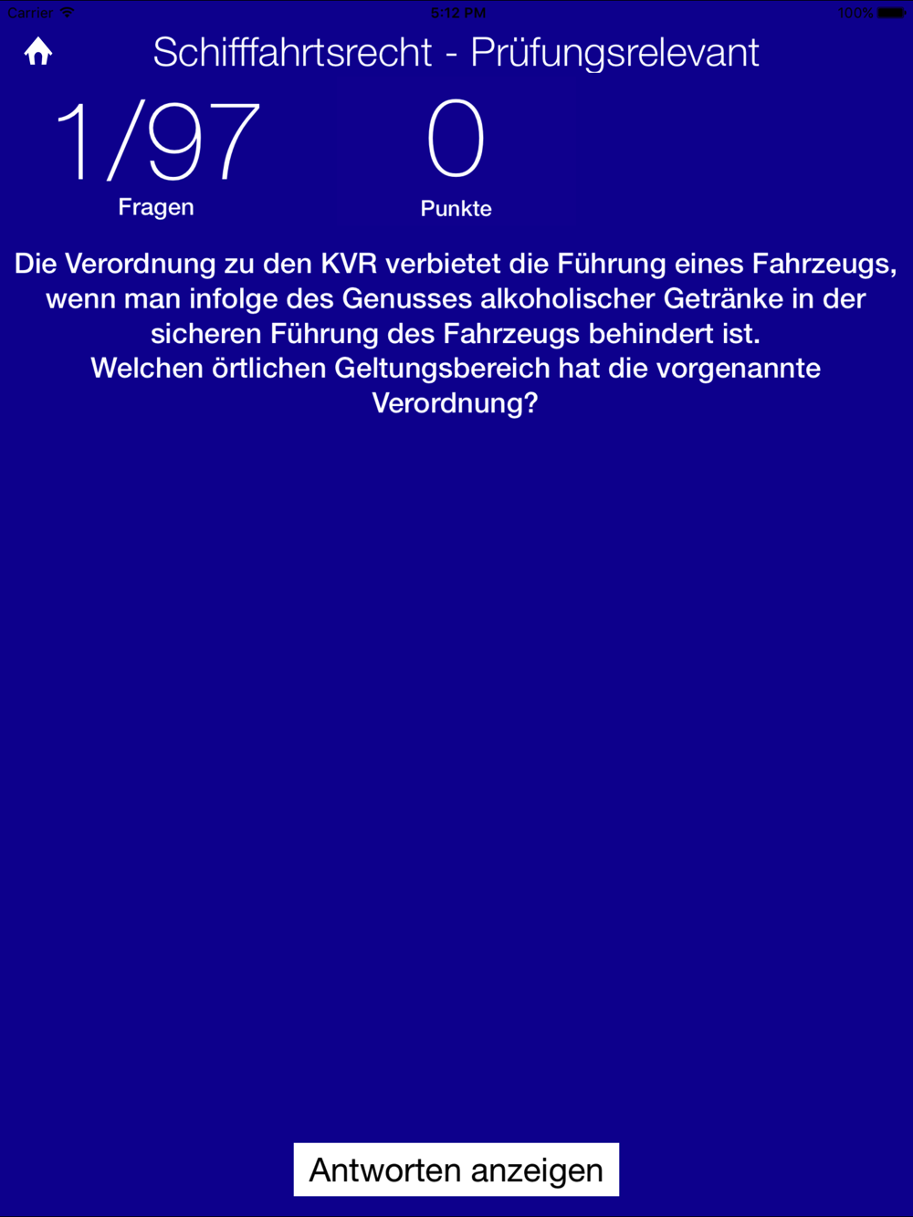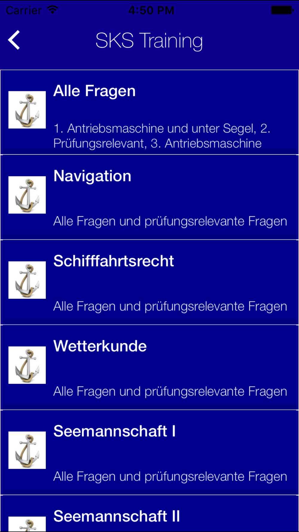 3. Die Fragenkataloge „Alle Fragen“, „Navigation“, Schifffahrtsrecht, Wetterkunde und „Seemannschaft I“ sind zusätzlich noch in "Alle Fragen" und in "prüfungsrelevante Fragen aufgeteilt.