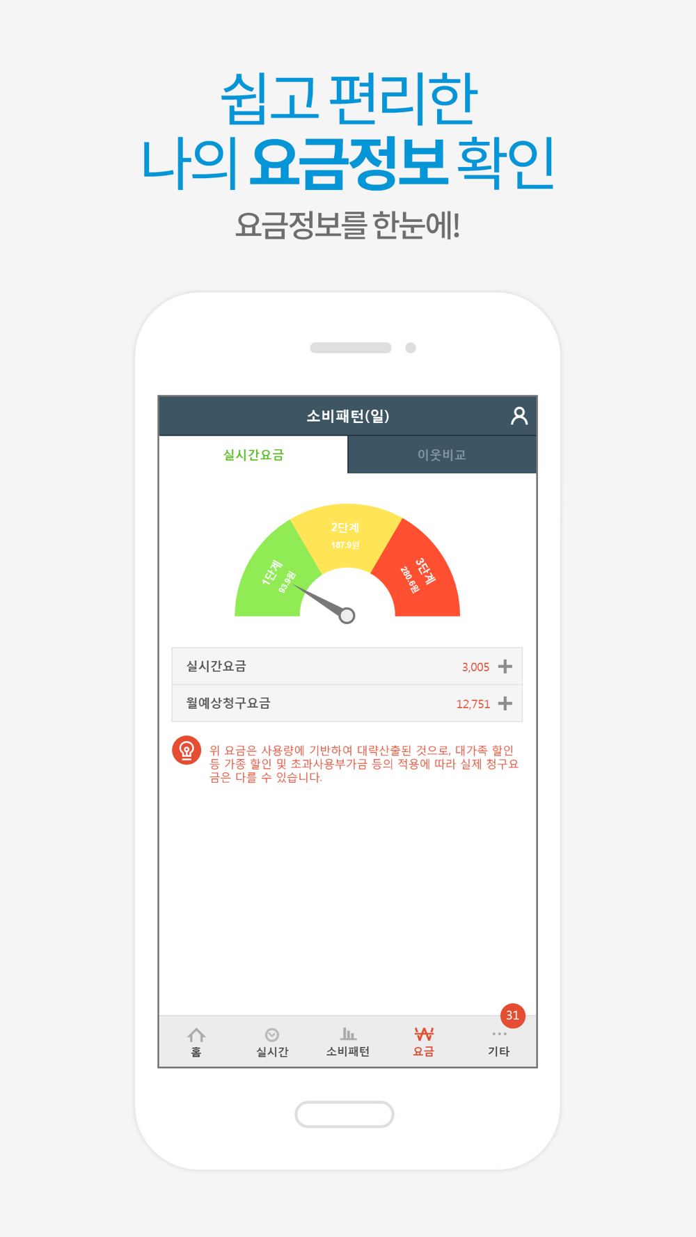 한국전력공사(KEPCO)에서 개발한 본 App.은 SG확산사업 고객을 대상으로 전기 사용내역 및 다양한 사용량 분석, 통계정보 등을 실시간으로 제공하여 고객의 계획적 전기사용 및 전기요금 절약에 도움을 드리기 위한 정보 서비스입니다.