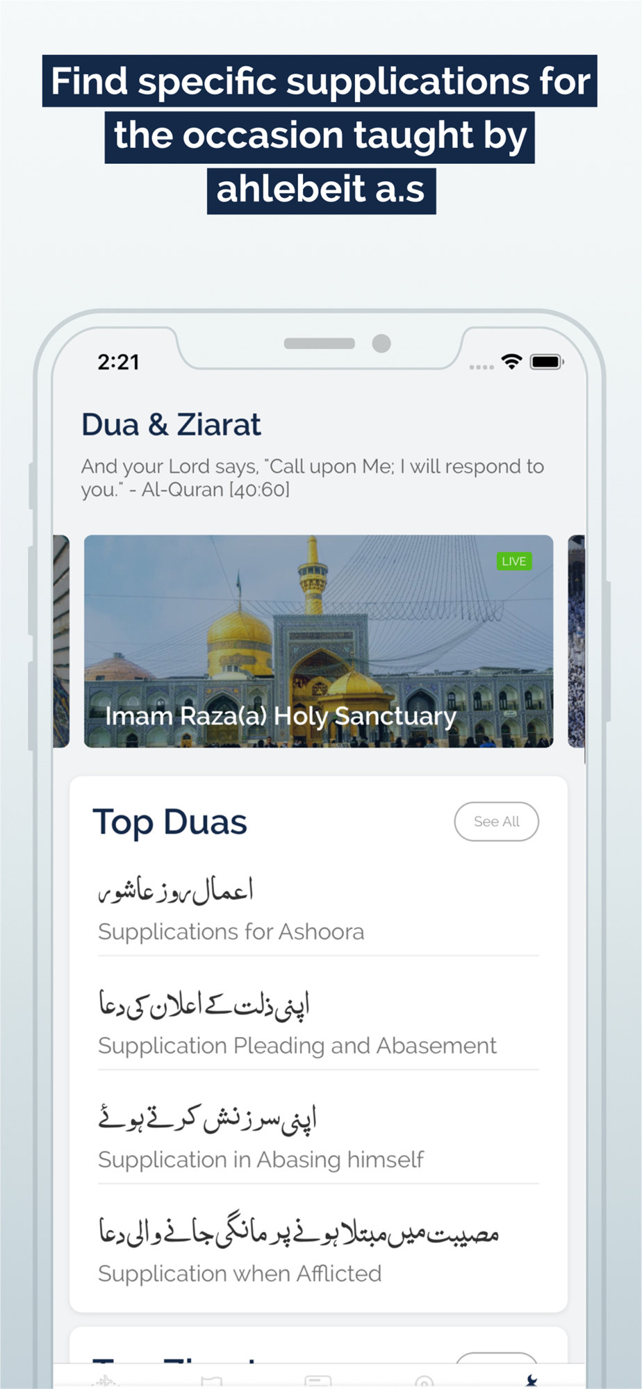 - Find a variety of supplications, ziaraat and munajaaat with their translations in one app.