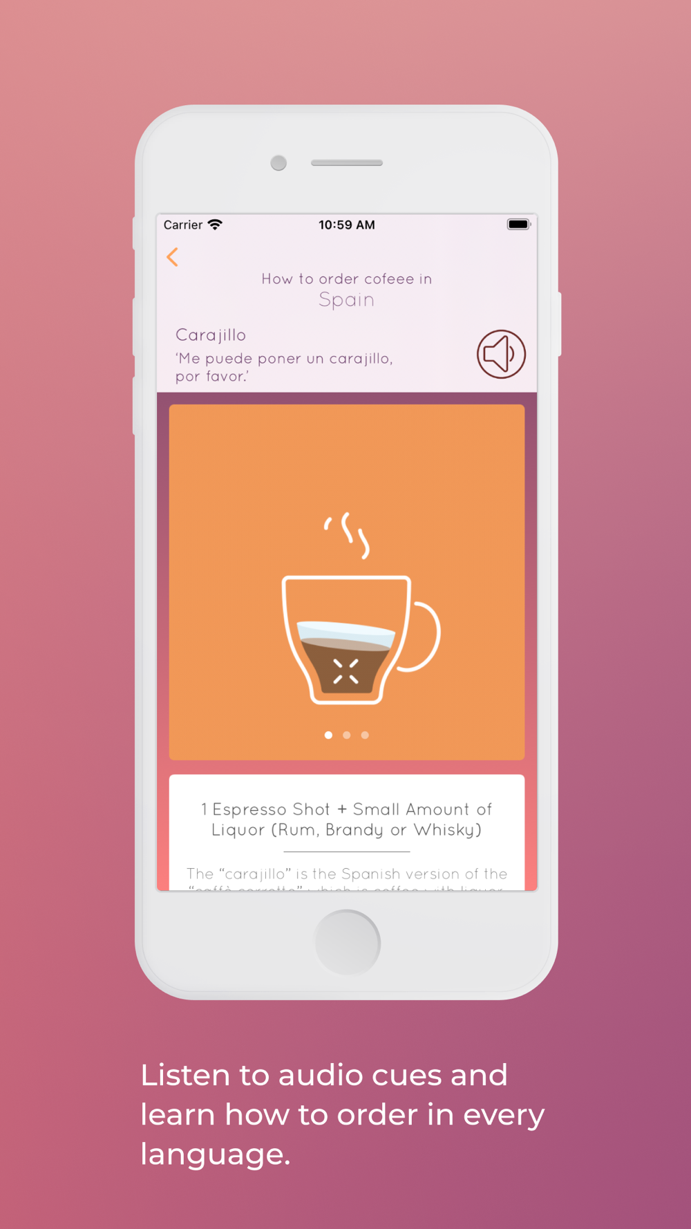 - Learn how to order your coffee like a local, with audio cues and pre-made sentences.