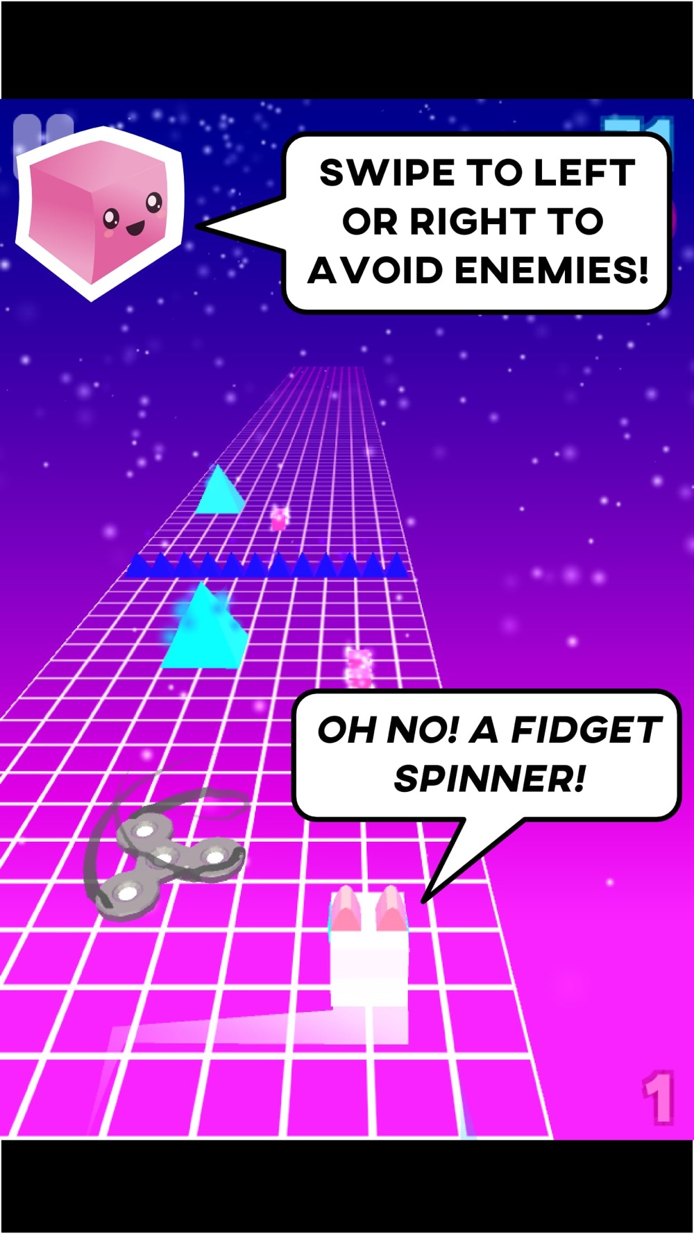 This game is an endless runner inspired by cute colors and the 80s. You are a cube that collects smaller cubes. You have to evade the attacking triangular enemies and fidget spinner enemies and the spikes on the ground. Press once to jump. Swipe left and right to evade. Try to reach as far as possible and collect as many cubes as possible! You also earn more cubes by completing goals that are assigned to you during your play. Spend your collected cubes in the shop on new cute cubes.