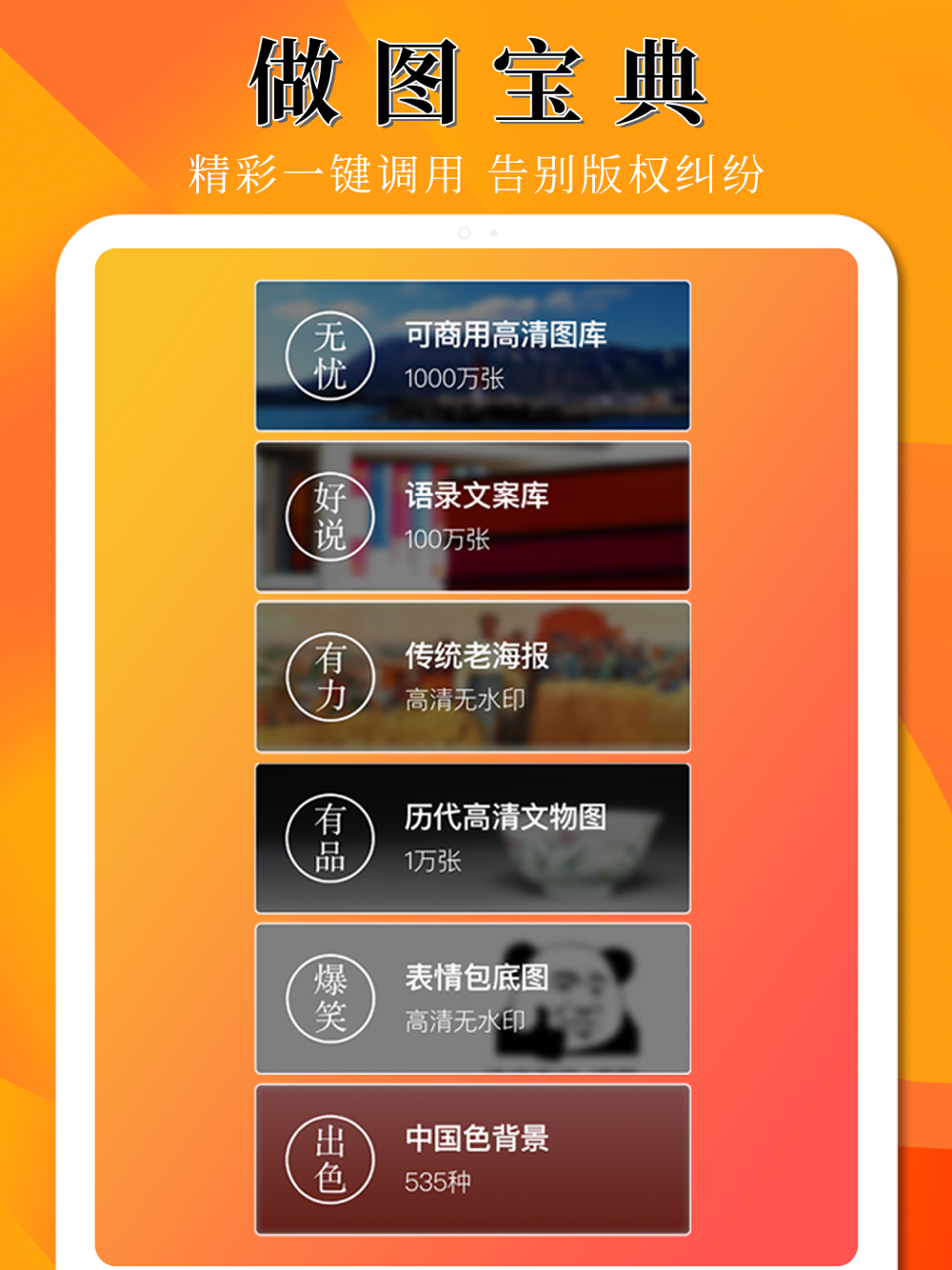 图曰让美好集合。千万可商用图片库,万件中华珍宝图库,百万精校语录文案,全部传统中国色,经典老海报等等资源,全部无水印对社会开放。把美装在口袋里,并可以做自己的再创作。