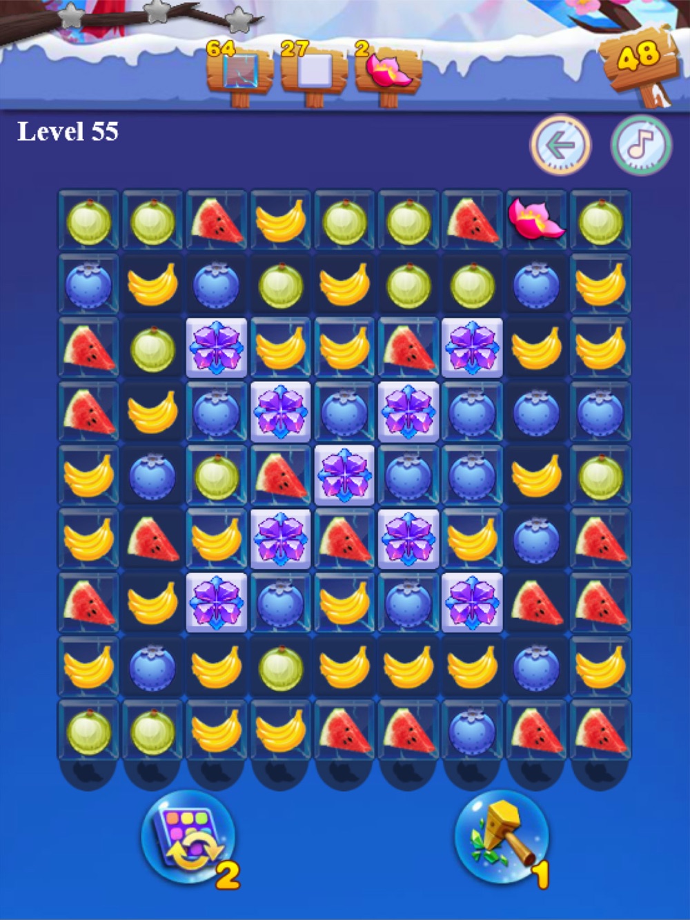 2.消除水果会同时融化附着在水果上的一层冰块,最厚的冰块需要被融化3次;