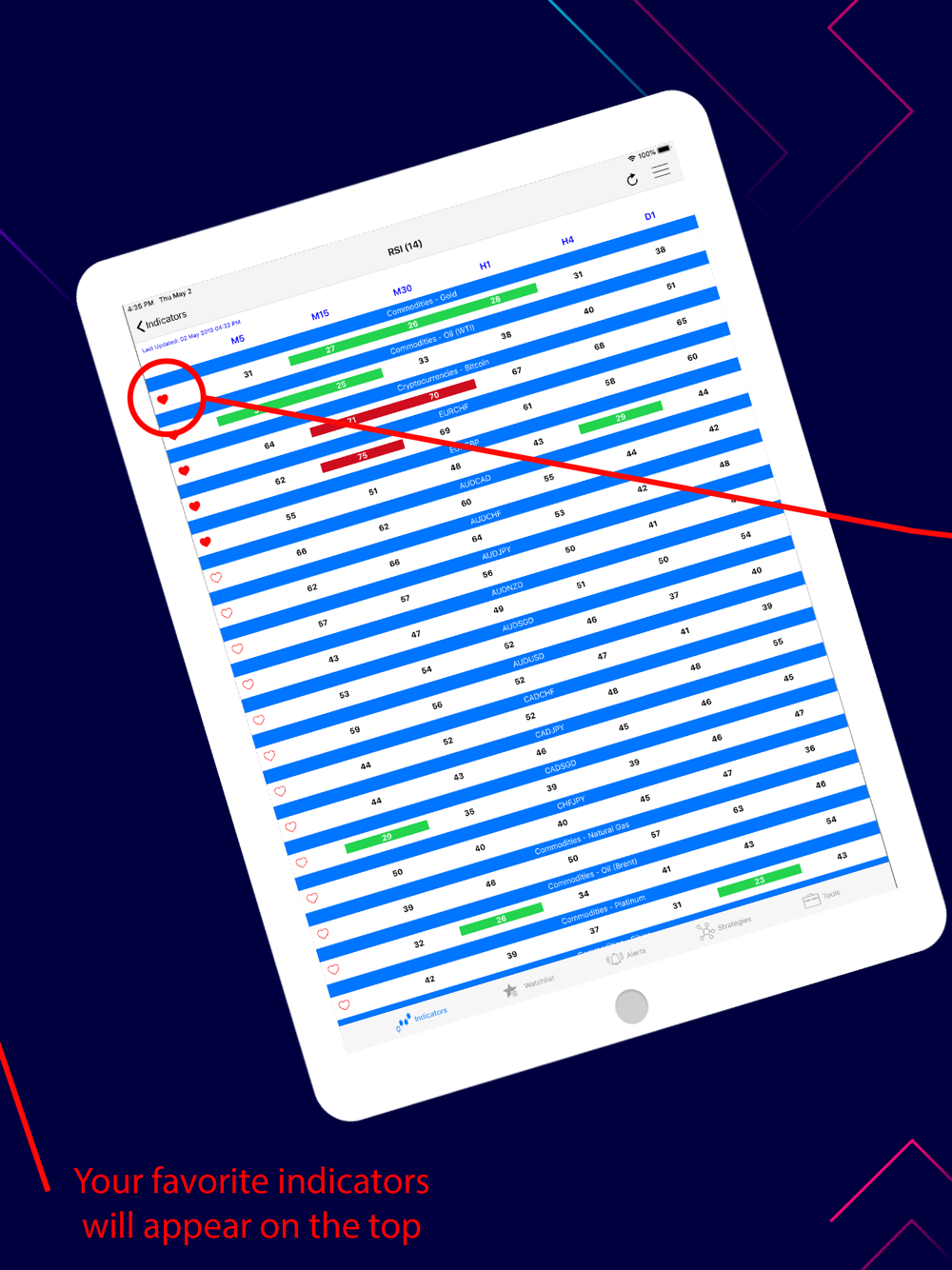- Indicators view which display full listing of all instrument for each indicator. You can toggle between the different indicators easily within the app.