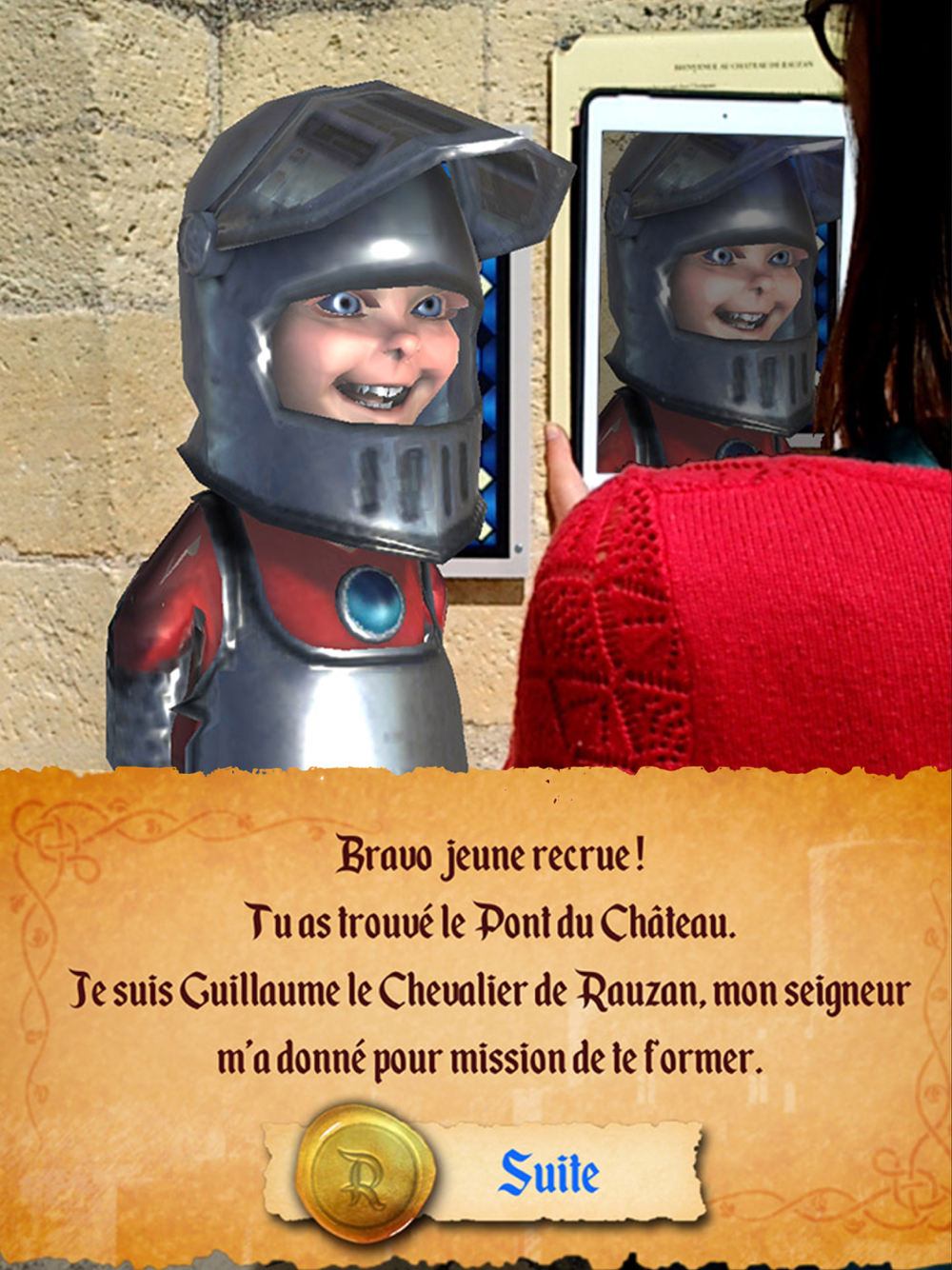 Grâce à ton smartphone ou à ta tablette, participe à ce rallye en réalité augmentée dans le château de Rauzan et rejoins sa garnison ! Laisse-toi guider par le chevalier Guillaume, explore tous les recoins du château-fort, résous des énigmes et réponds à des questions pour obtenir ton diplôme d’or, d’argent ou de bronze. Sois acteur / prends en main ta destinée de chevalier !