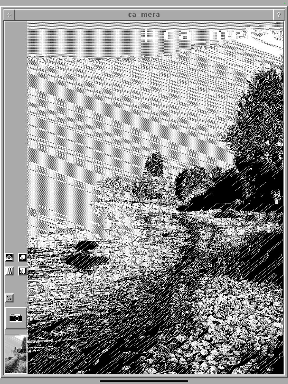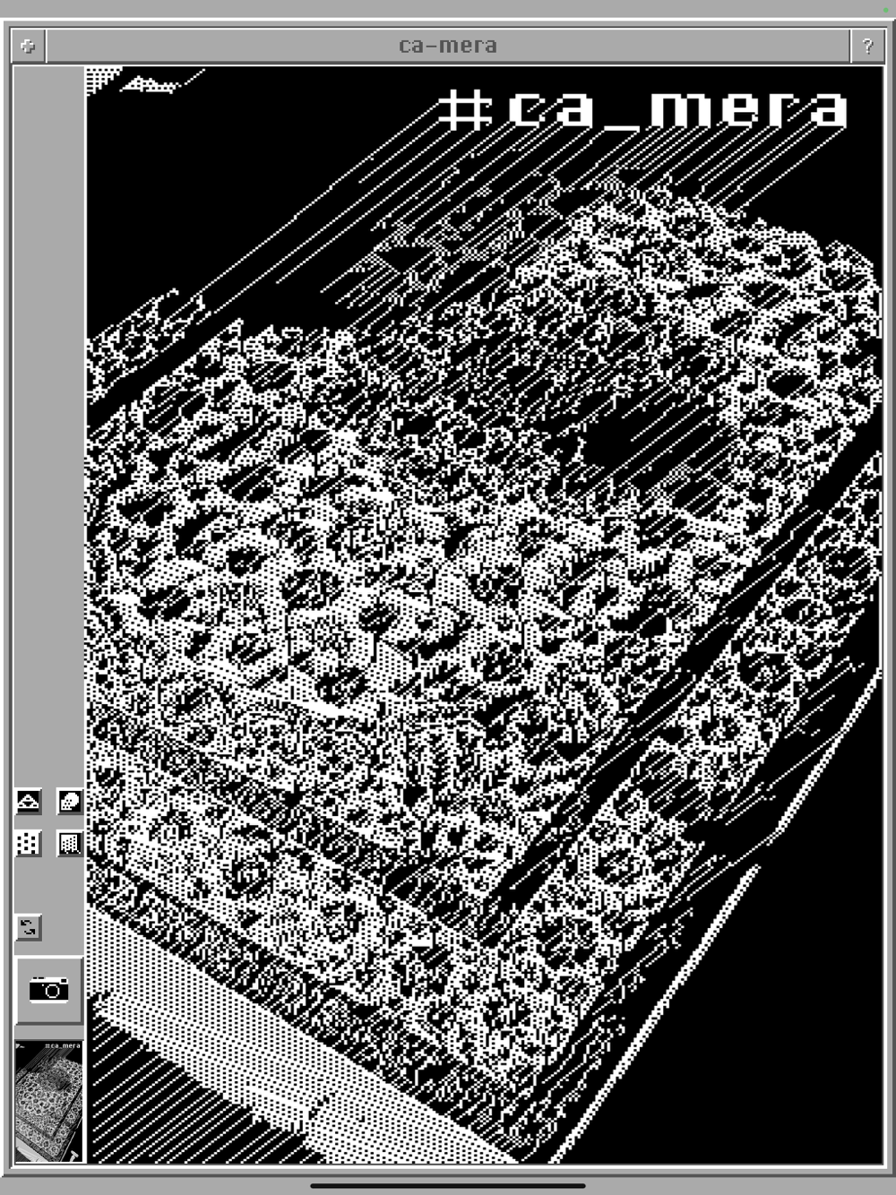 Probably the nerdiest camera app ever made, ca-mera uses a cellular automaton to interpret the brightness values of your camera stream. The resulting images are black/white and pixelated, and contain unique patterns created by the cellular automaton (Wolfram rule 126).