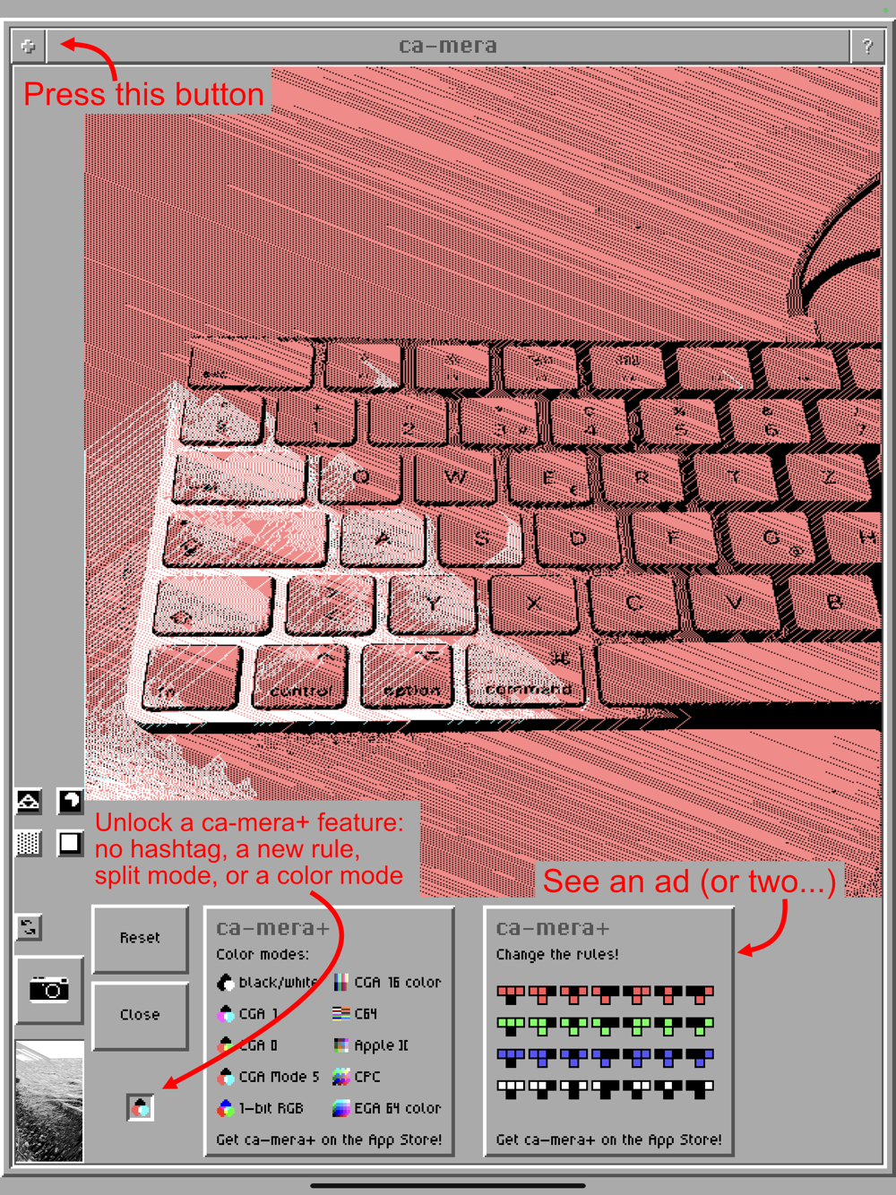 Furthermore, features from the more advanced ca-mera+ app can be unlocked inside ca-mera by tapping the "+" button and watching our handcrafted ads.