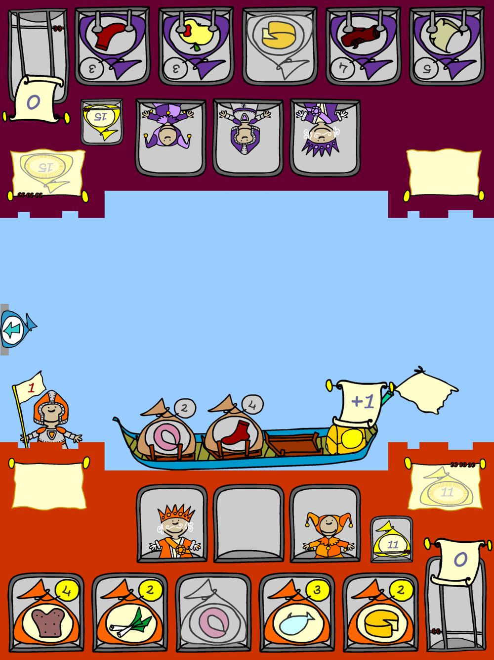 The supplies in your castle are not in order. Fortunately, the trading boat comes by so that you can buy the stuff you need. To make money and to get rid of things you don't want, you sell to the boat. You also get money if your opponent buys something from the boat you placed on it.