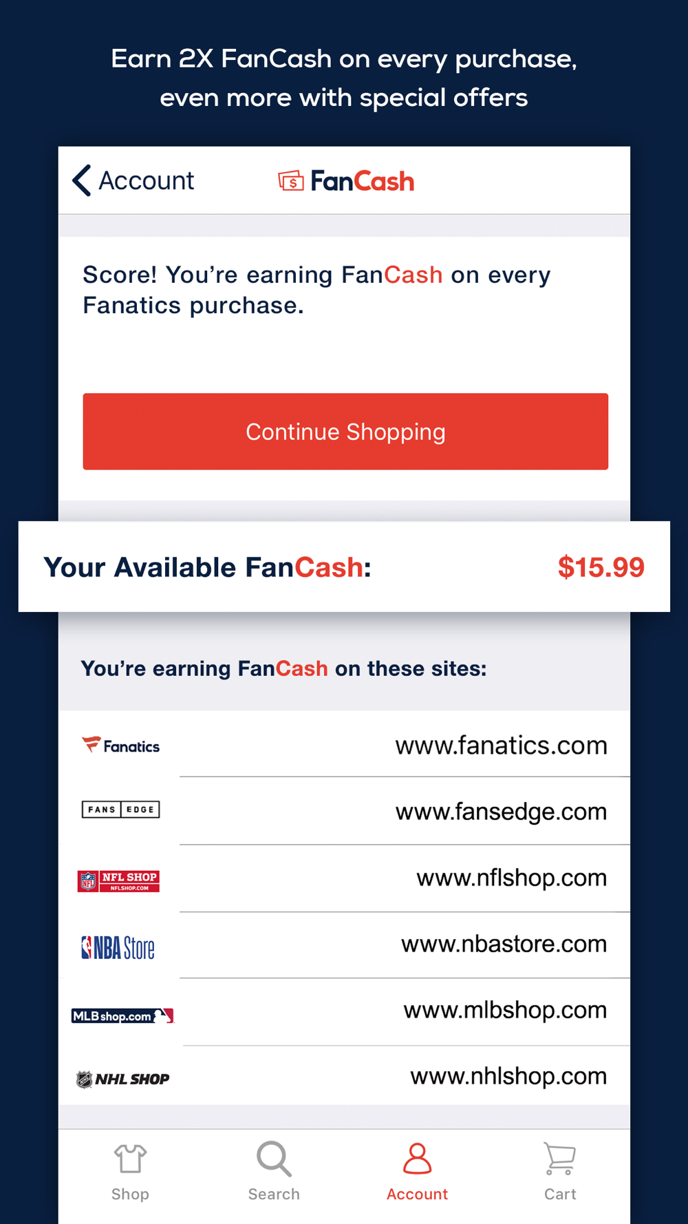 We’ve updated our FANATICS REWARDS so app users can get 2X Fan Cash! FANATICS REWARDS costs nothing to join and gives you:
