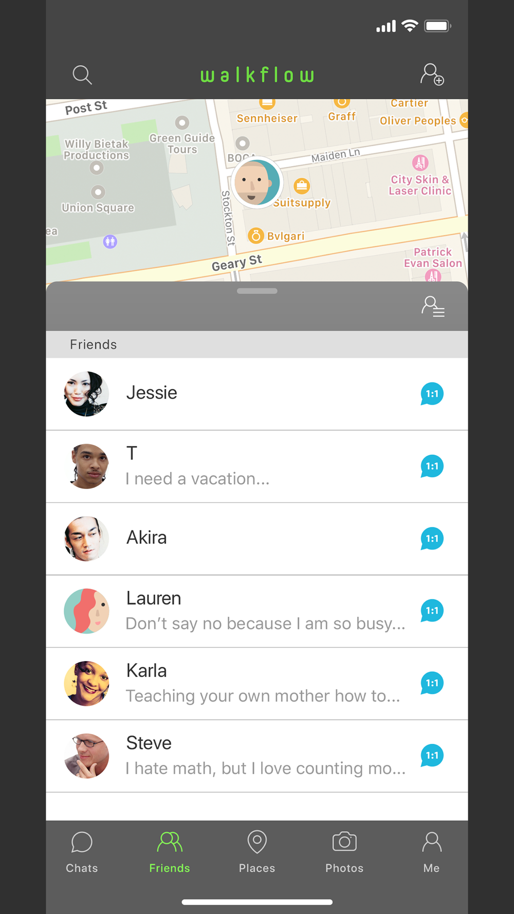 WalkFlow is a chatting app on the map. Friends can chat while checking the location of each other on the map. This feature of WalkFlow based on the mutual location disclosure with friends in the chat room distinguishes with other existing messenger apps.
