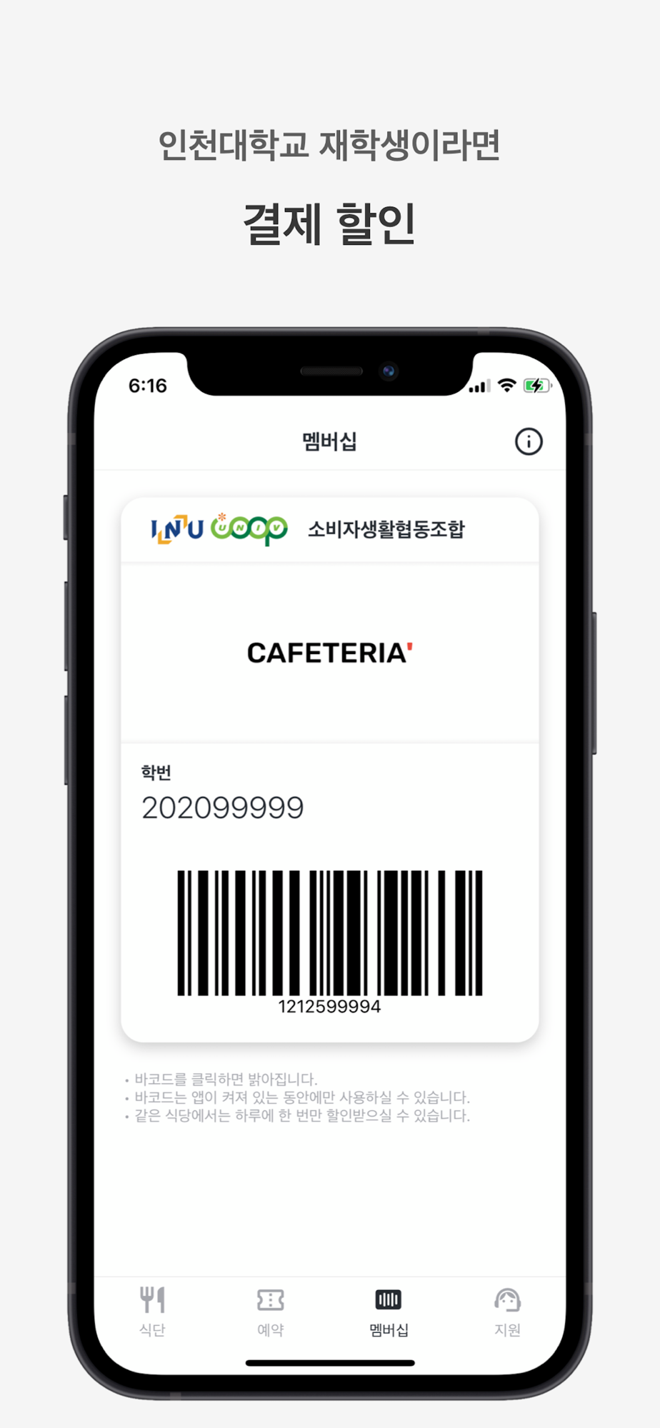 카페테리아는 밥 먹으러 갈 때에 쓰기 좋은 앱입니다. 앱을 열고 바코드를 띄우면 결제할 때에 할인을 받을 수 있습니다.