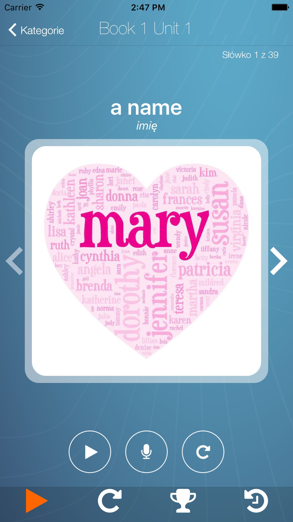 In the Words app you will be able to listen to the correct pronunciation of English words, recorded by native speakers. The meaning of each lexical item is shown with a picture which helps to understand it. The app will enable you to both learn the meanings and the pronunciation of words.