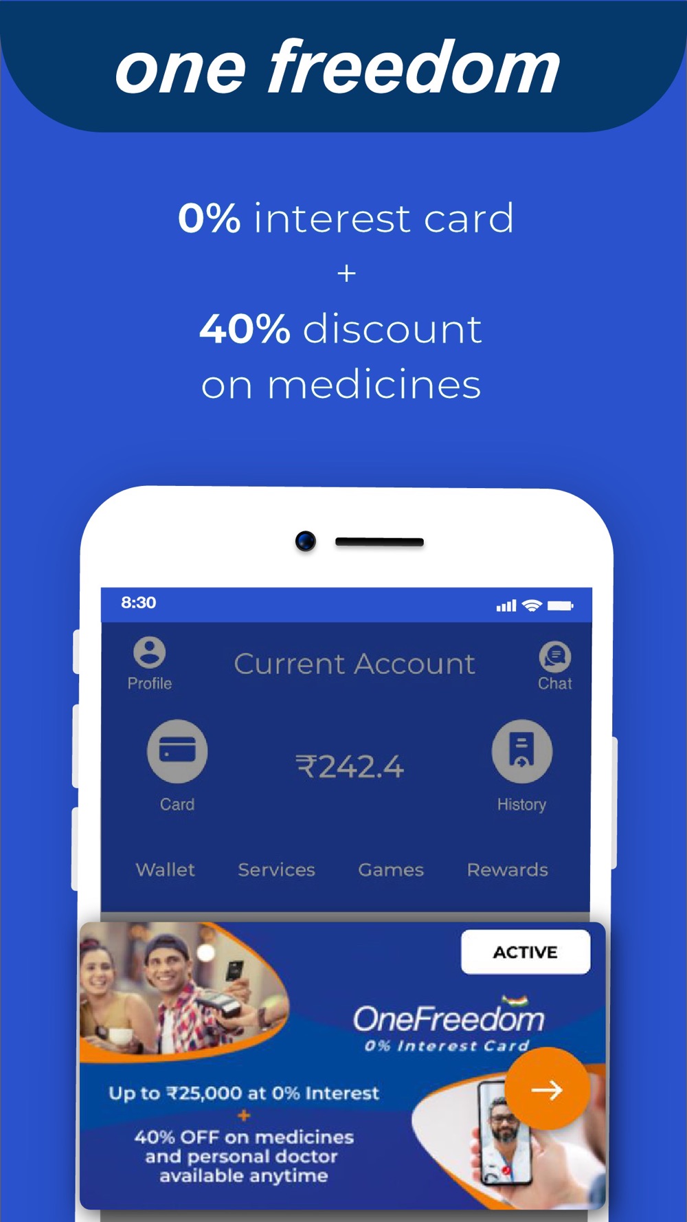 Introducing dhani One Freedom: One card with two benefits - get Zero% Interest Credit Lines up to ₹1,00,000 instantly and up to 50% discount on medicines with free doctor consultations. Use your Zero% credit line across all online & offline merchants and payback in 3 easy interest-free EMIs.