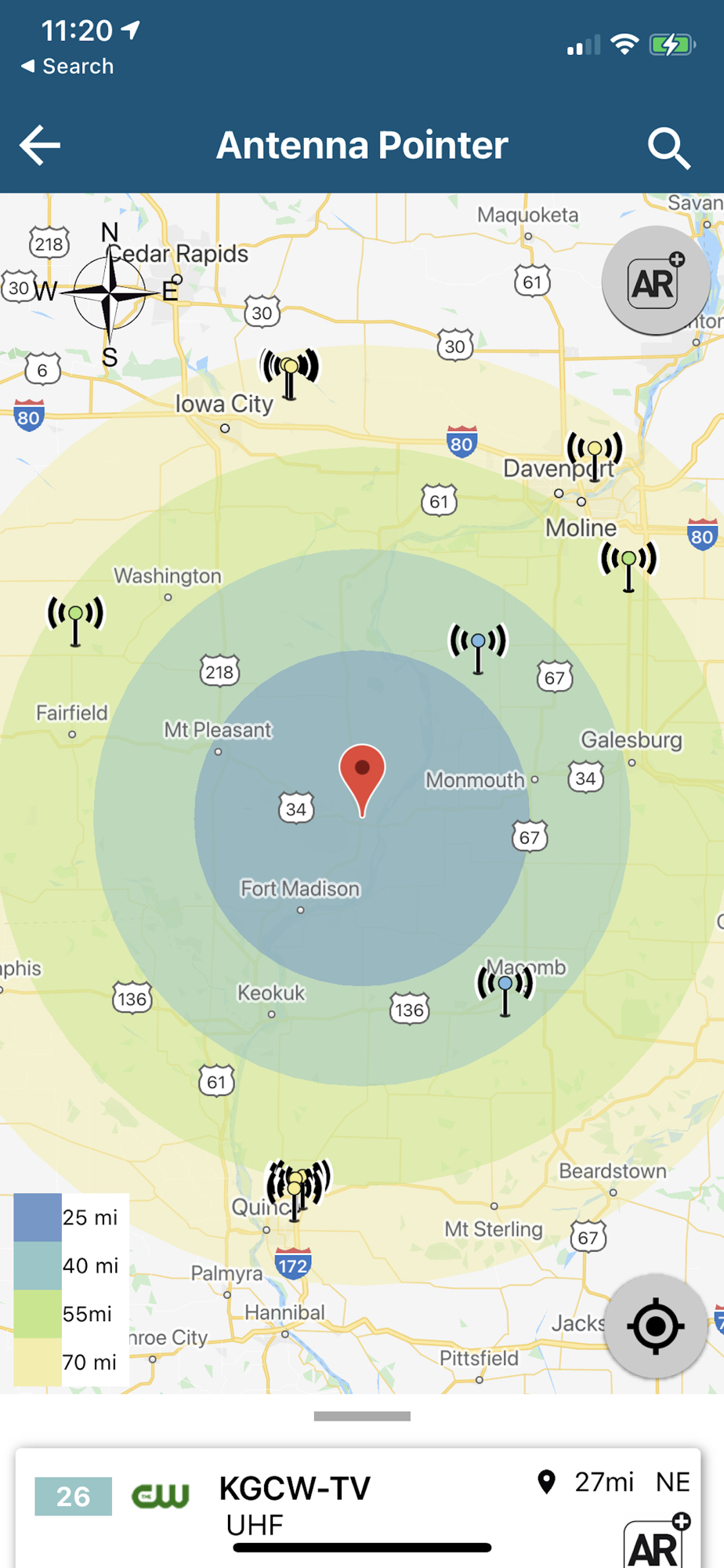 - Antenna Pointer - Use the top-down map view to locate all HDTV TV towers closest to your address or GPS location. Eliminate signal obstructions such as trees, hills, and buildings by switching to the AR view. Simply point your phone to the horizon and rotate 360 degrees to bring into view your desired TV tower and find the best angle to point your antenna. The number displayed above a tower indicates the number of channels available. Tap the tower icon to see full channel details.