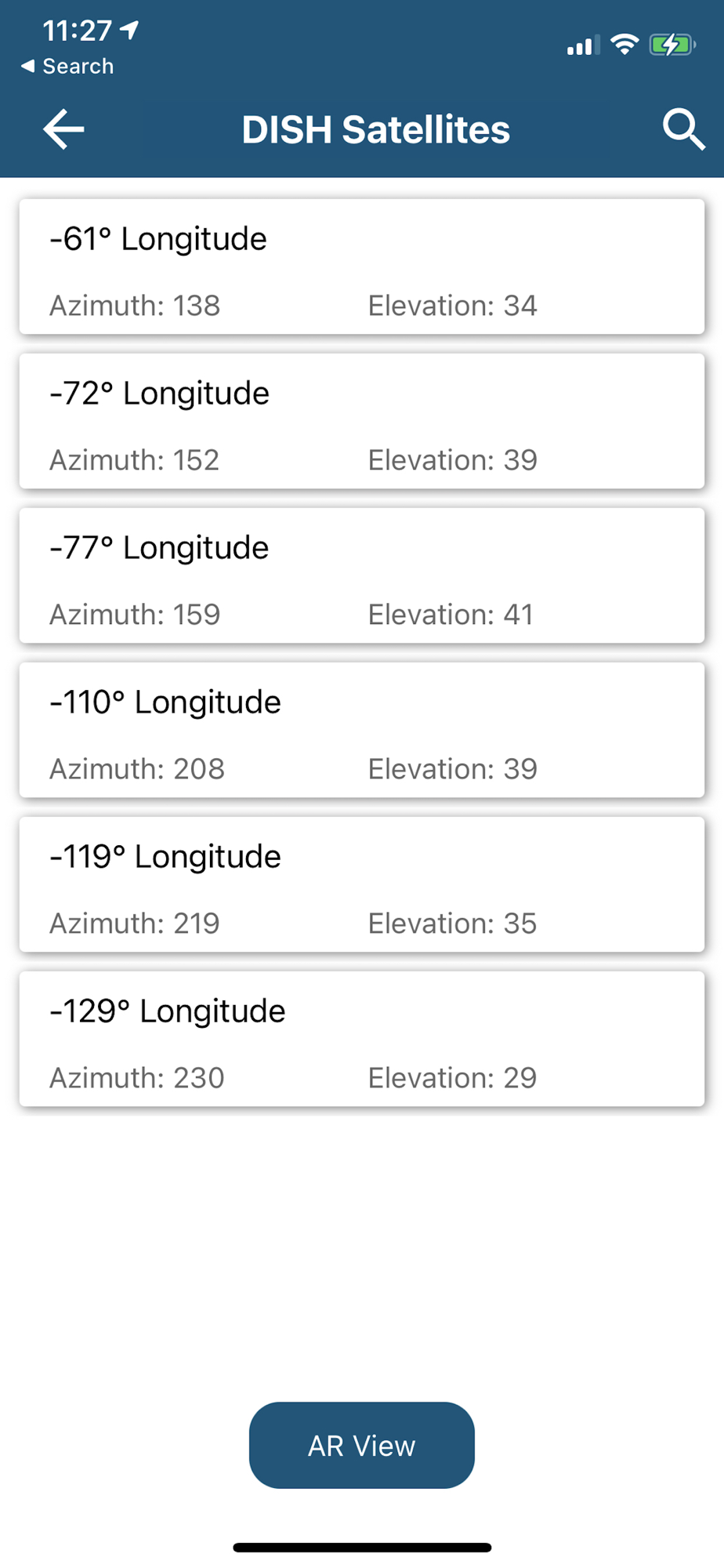 - Satellite Pointer - Use the AR view to locate DISH, DIRECTV, BellTV, or Shaw Direct satellites available for your mobile antenna. Simply point your phone at the southern sky to locate your target satellites and stay clear of signal obstructions such as trees and buildings. Azimuth and elevation pointing look angles are provided for easy pointing and setup of manual antennas.