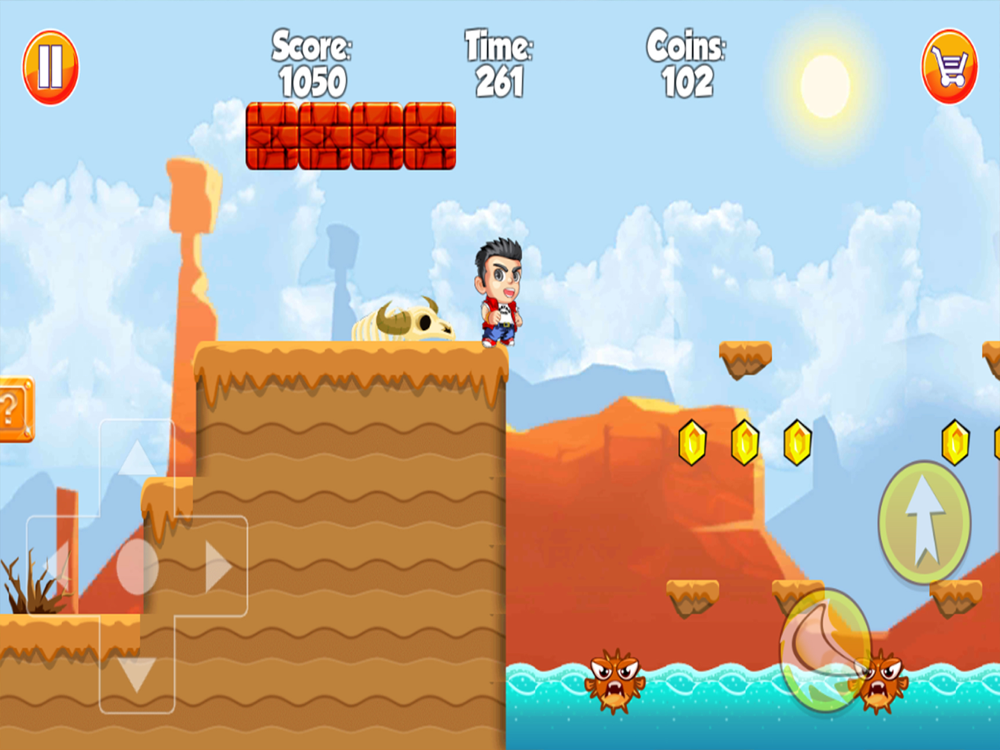 Climb up huge mountains and stairs, fight against prehistoric enemies, avoid falling bricks, find hidden blocks and levels, collect coins and diamonds, swim through dangerous seas, explore lot of challenging and addictive jungle worlds and lands and defeat all cruel enemies and bosses.