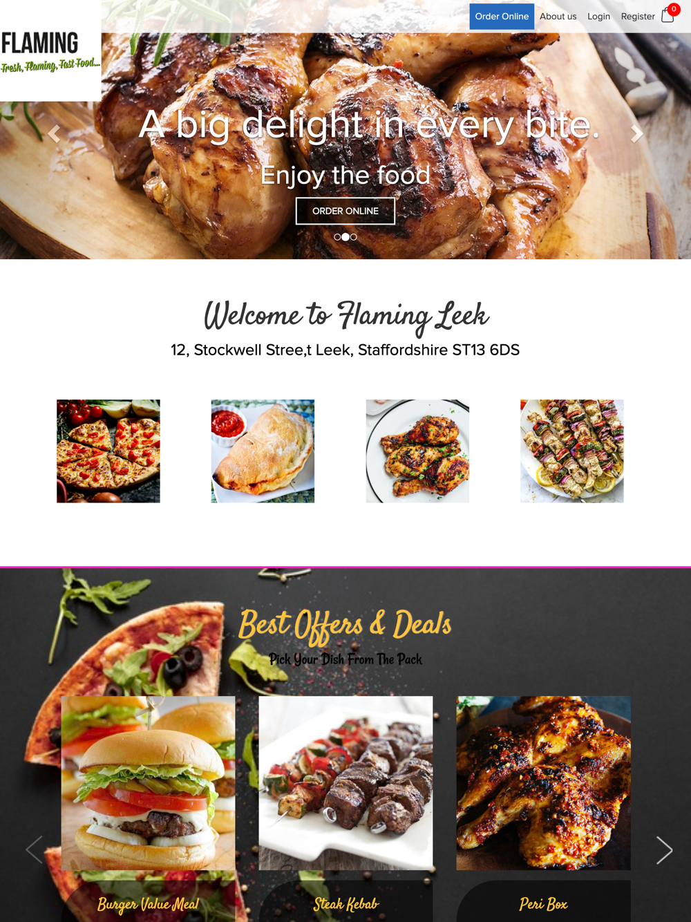 Flaming Leek is based at 12, Stockwell Street, Leek, Staffordshire ST13 6DS. We aim to bring all of our customers the best value for money, services and food around, plus we are constantly aiming to improve our service in Leek. You can now order food online. Try our online website which contains all our menus. We offer deliveries to all surrounding areas of Staffordshire. We offer all our customers fast food delivery. You can now order your favourite dish online and get fast home delivery. We are very particular about our service and quality to give our customers a better experience; which is why we are now proud to offer this fantastic online ordering website. You can even pay online and get your food delivered to your home in Leek.