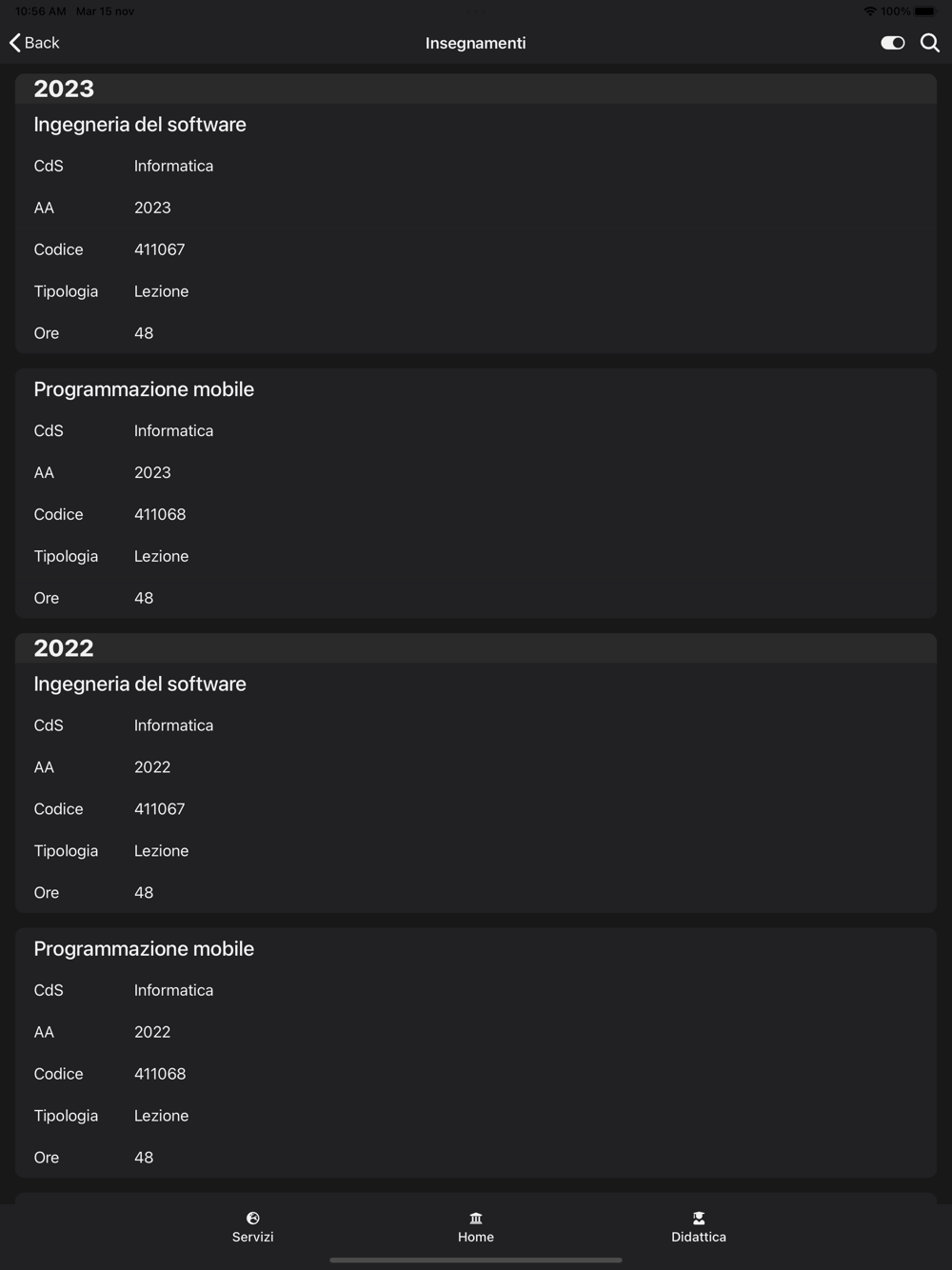 - Carriera: visualizza il piano di studi o il libretto con gli esami sostenuti e quelli ancora da superare. Organizzali per anno accademico, nome insegnamento, voto. Accedi direttamente agli appelli, il materiale didattico, le video-lezioni o le statistiche storiche per gli insegnamenti nel tuo piano.