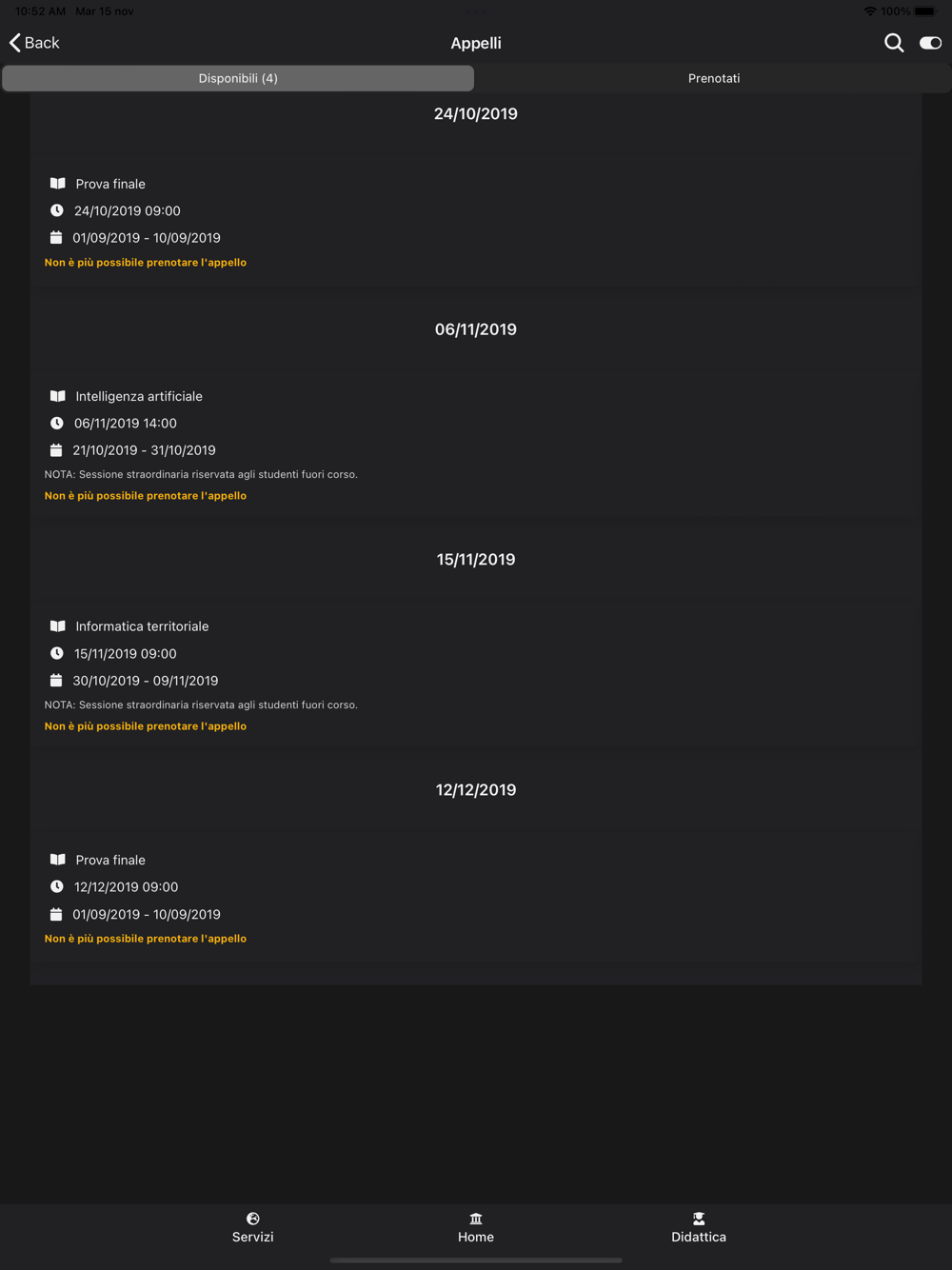 - Appelli: visualizza gli appelli disponibili, se l'icona è verde puoi prenotarti immediatamente per l'appello. Puoi anche visualizzare il numero di studenti già prenotati.