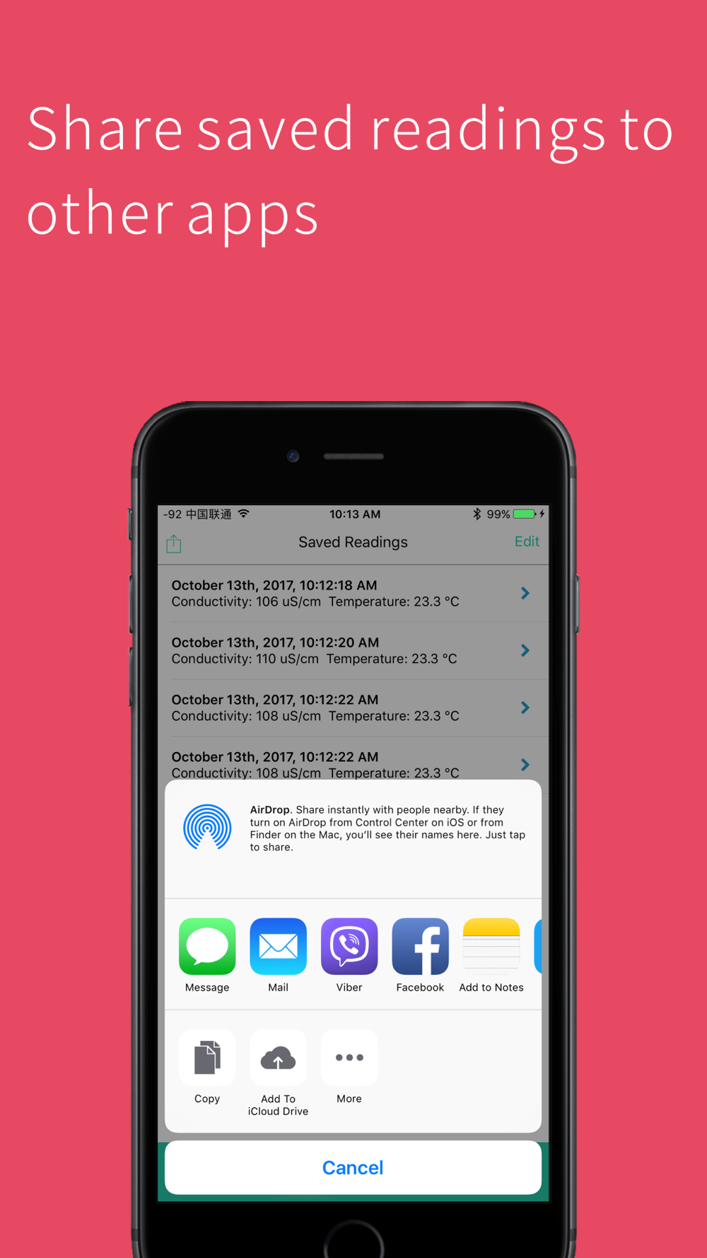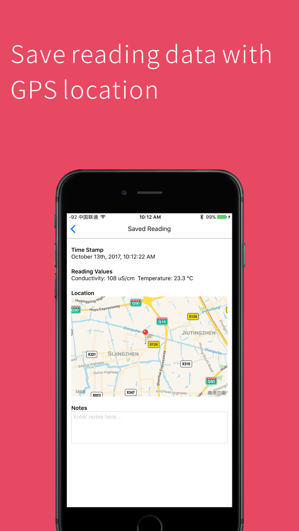 Geo-tagged data storage, data sharing, temperature display, calibration reminders, calibration log, and more.