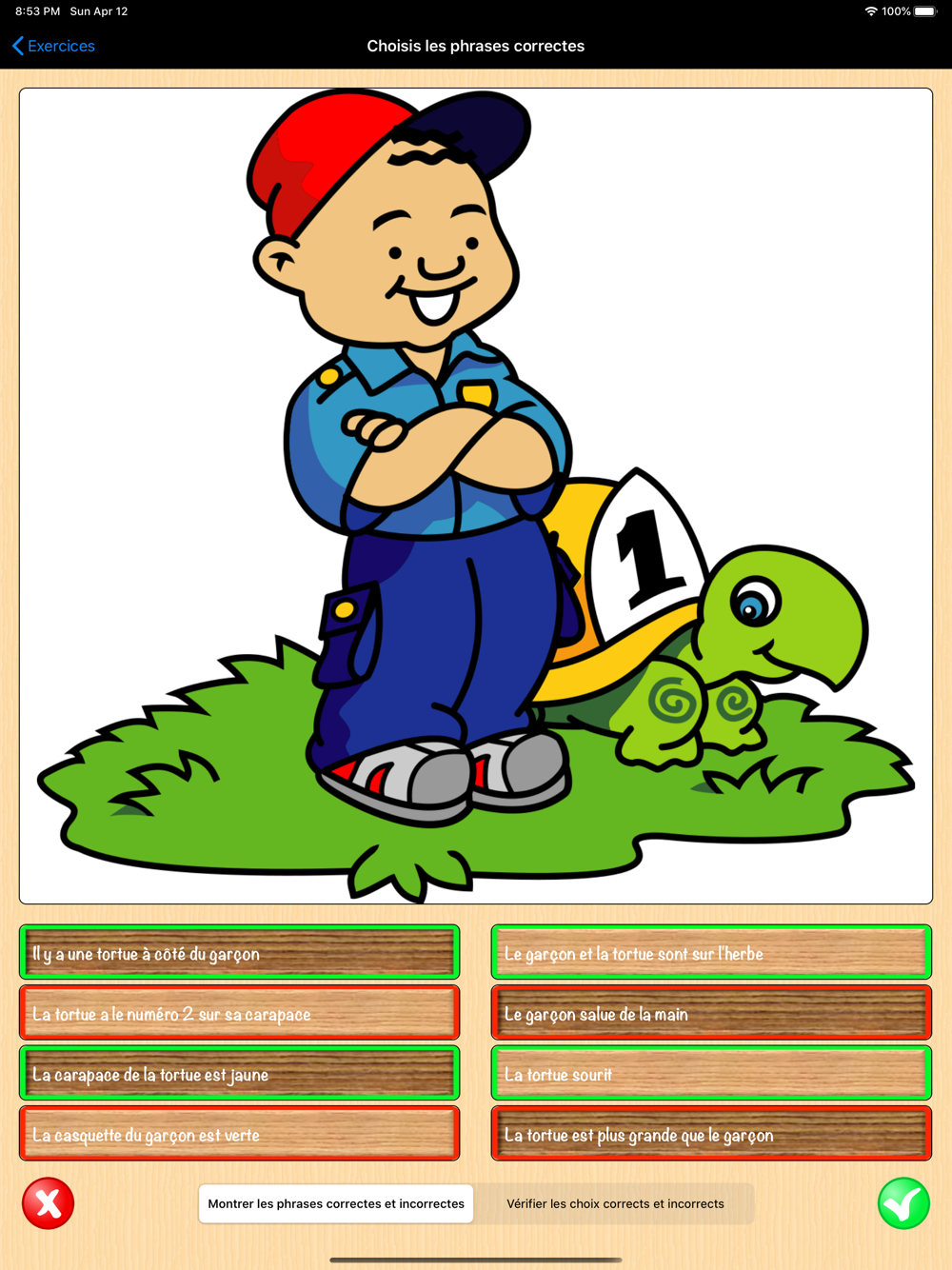 The player chooses the correct sentences (multiple choices are possible). Once completed, it can check if the right choices were made.