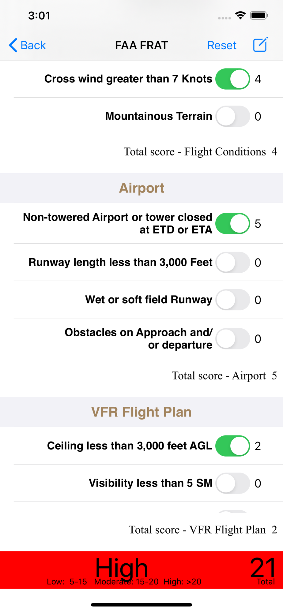 The tests you create can contain simple yes/no questions, numeric questions, or text input fields. For example, the FAA FRAT give a 10 point credit if the pilot is IFR rated (a yes/no question), or you could create a numeric question where if the pilot has less than 25 hours in type they score 5 points; less than 50 they score 3 points, etc.