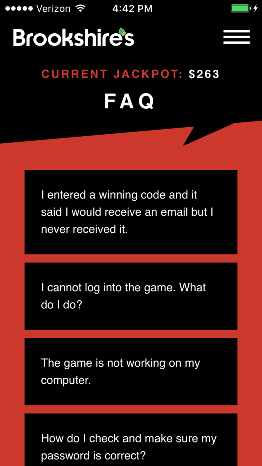 Welcome to "Brookshire’s See RED and WIN" App. Customers and Partners participating in the “Brookshire’s See RED and WIN" Collect & Win Game may use the app to (1) register for the online game; (2) enter and track their official online codes found inside of select game tickets; (3) optically scan the ticket codes they receive in-store; and (4) find Rules & Odds Charts, Winners, Frequently Asked Questions, Prize Submission Forms, Privacy Policies, Customer Service, etc.