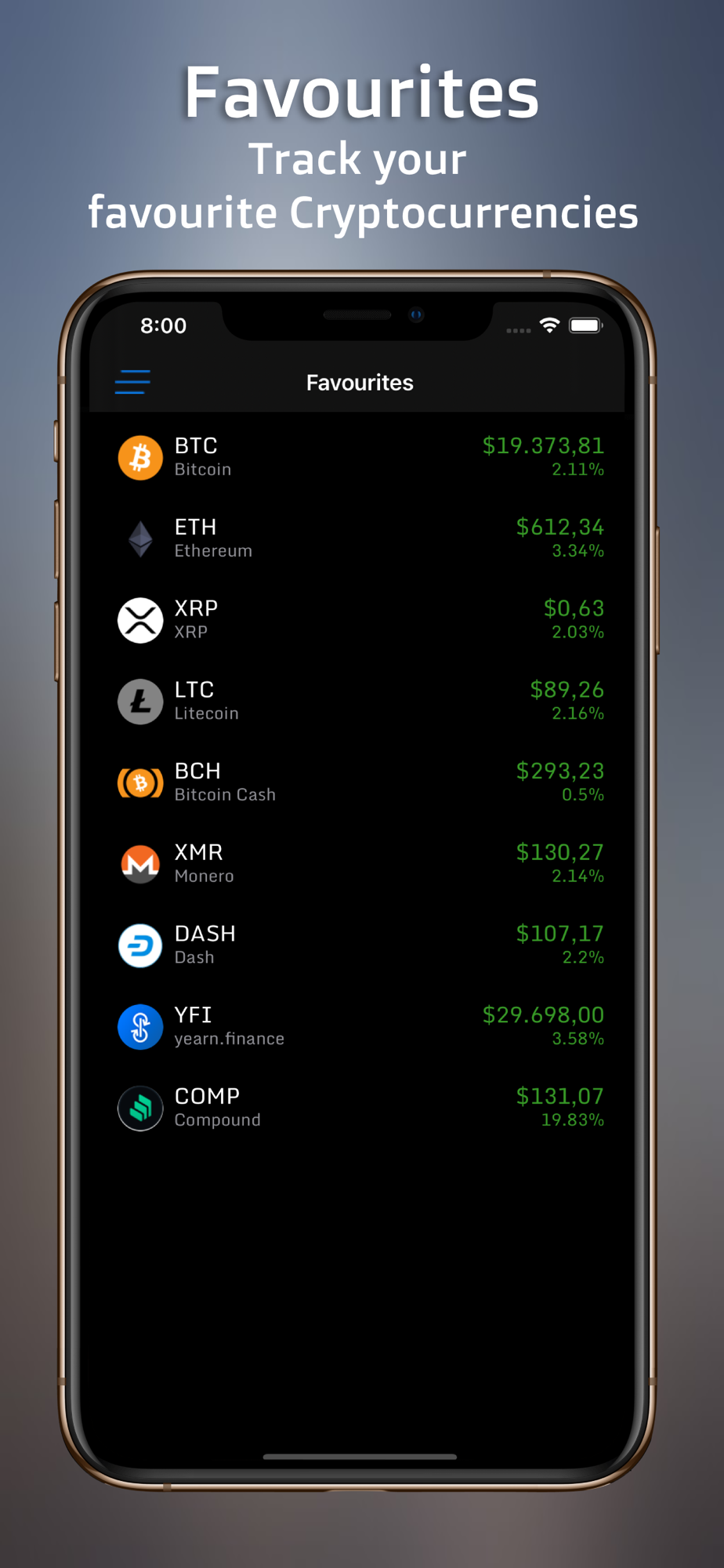 * Swipe left will magically teleport you to the Favourites section, here you can quickly see all your favourite cryptocurrencies.