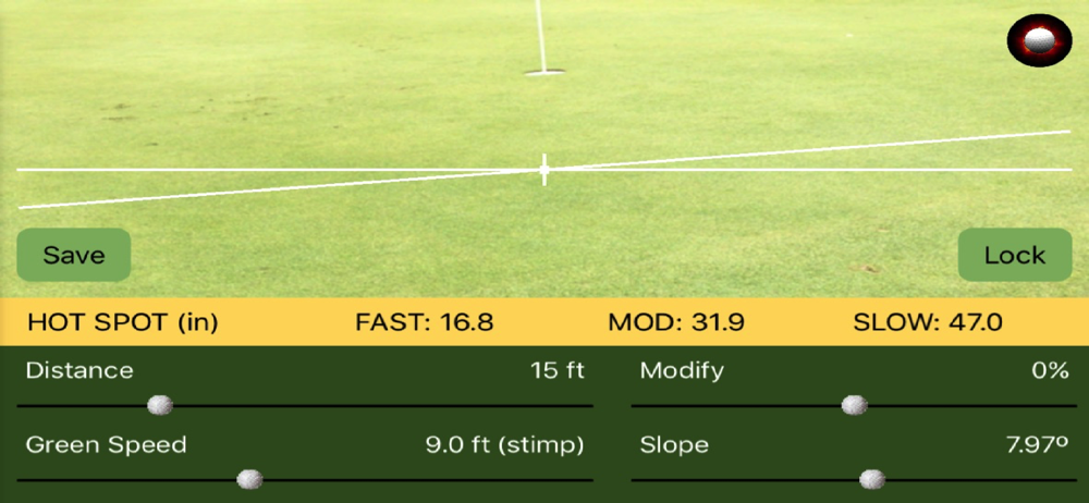 · Enter Distance, Green Speed and Slope. (Use the automated slope gauge to capture the slope of the green). Just tilt your phone to align with the slope of the green or lay it down by the hole! Press "Lock" to lock in Slope value and the Hot Spot is displayed.