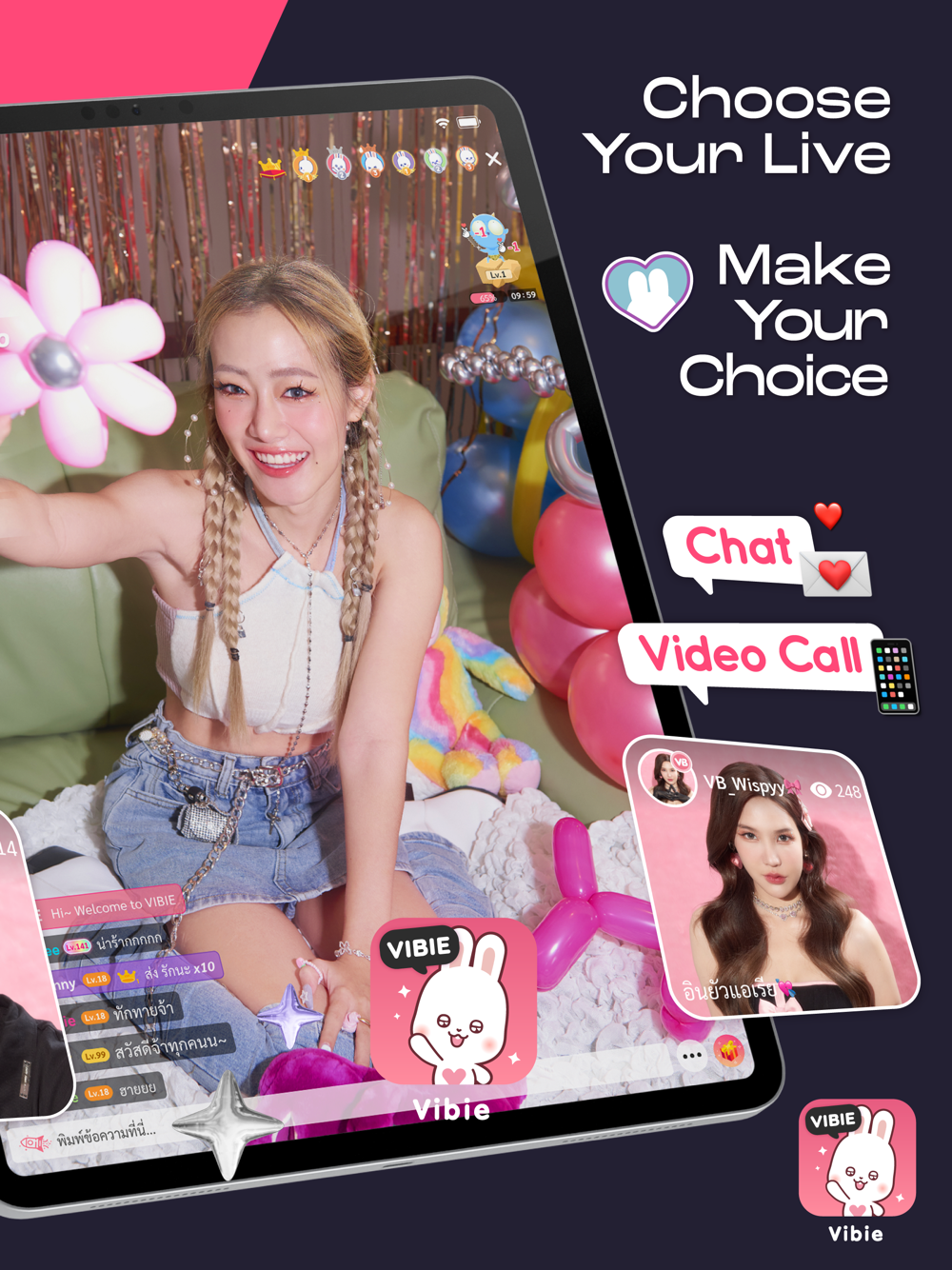 Live your story, lifestyle, funny moment, fashion, beauty, traveling trip, foody, various style, tutoring and etc. Get many reward and gift from Vibie live by joining our Vibie’s Events with your favorite broadcaster!