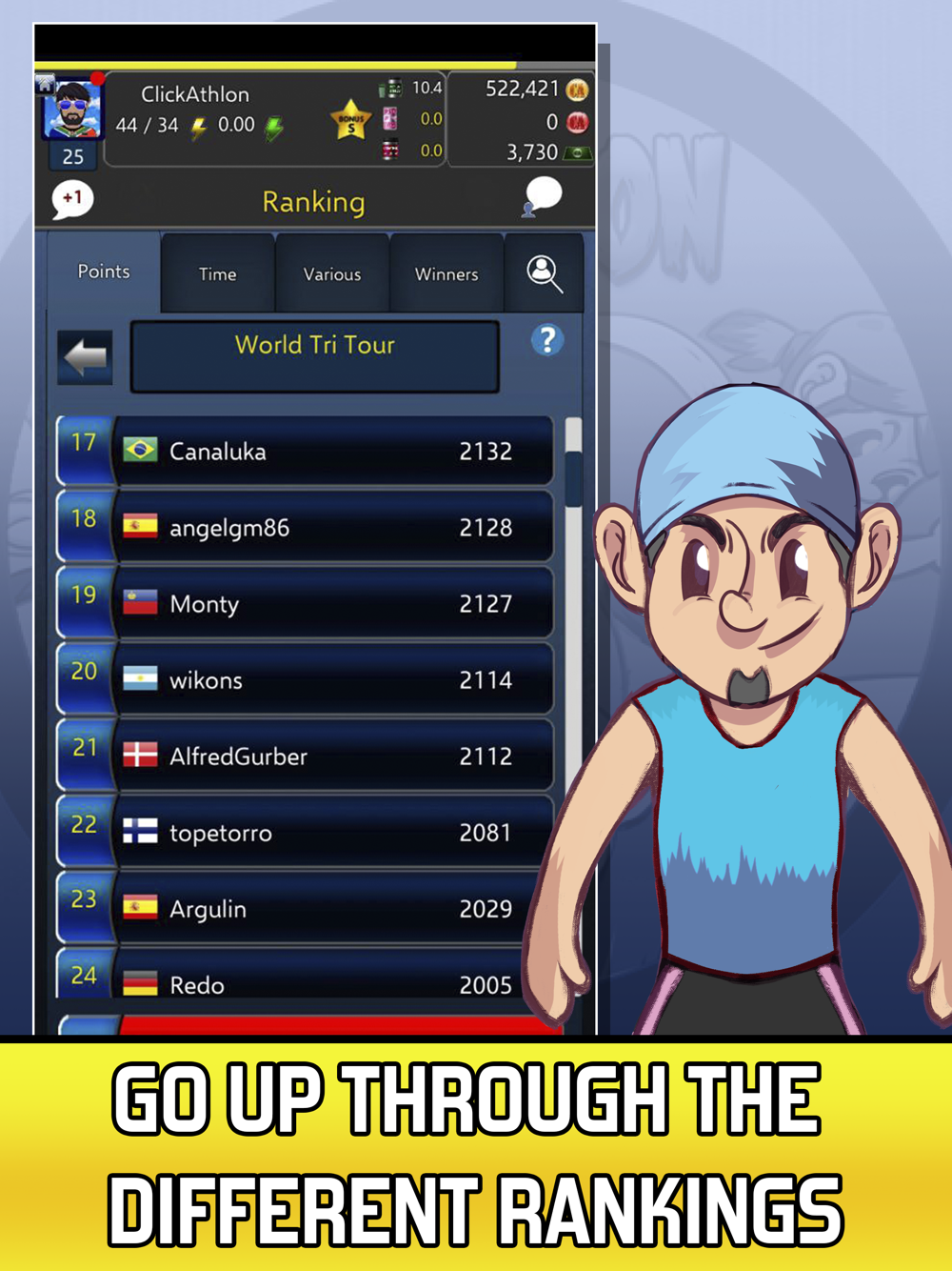 Trong ClickAthlon, bạn sẽ có một loạt thành tích và nhiệm vụ phải thực hiện mỗi ngày và mỗi mùa, nhưng bạn cũng có thể tự mình đặt mục tiêu, giành được phân loại chung, danh mục, đánh bại kỷ lục của quốc gia bạn trong 100 mét miễn phí hoặc đơn giản là cải thiện thương hiệu trong 10.000 mét mịn.