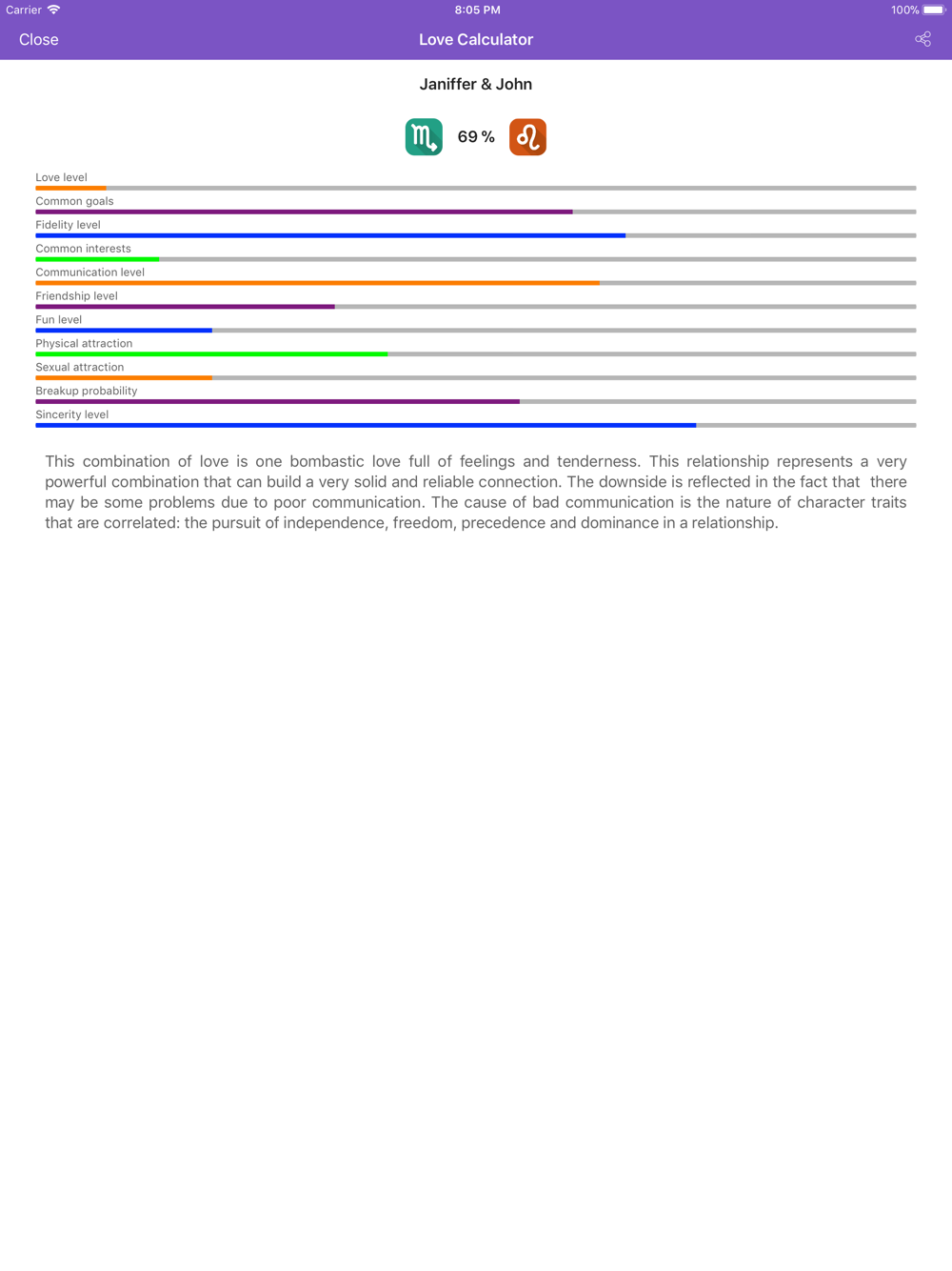 Find out your overall love level, common goals, fidelity level, common interests, communication level, friendship level, fun level, physic attraction, breakup probability, sincerity level