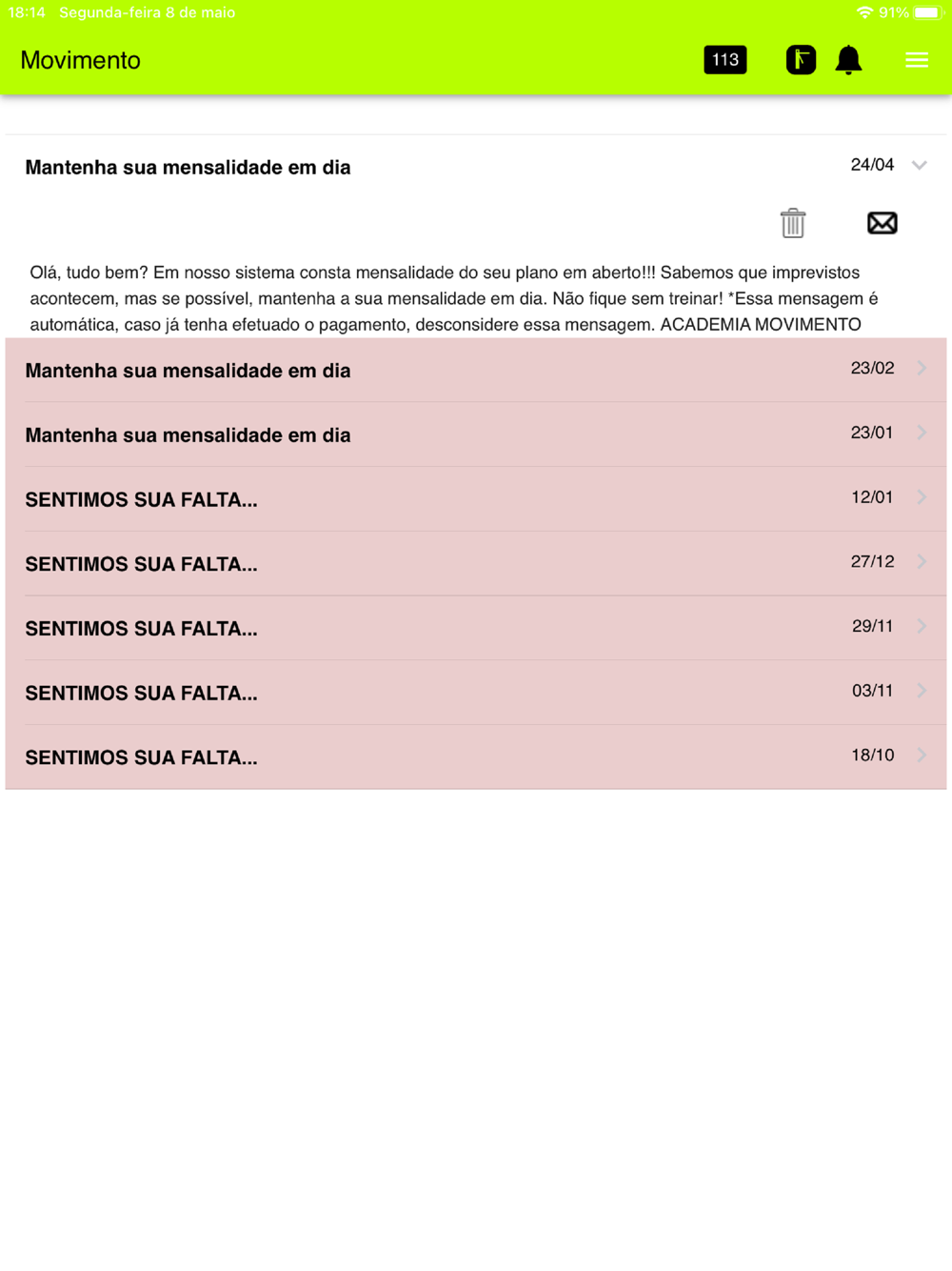5- Mensagens: O aluno receberá mensagens da academia com as mais diversas informações e novidades.