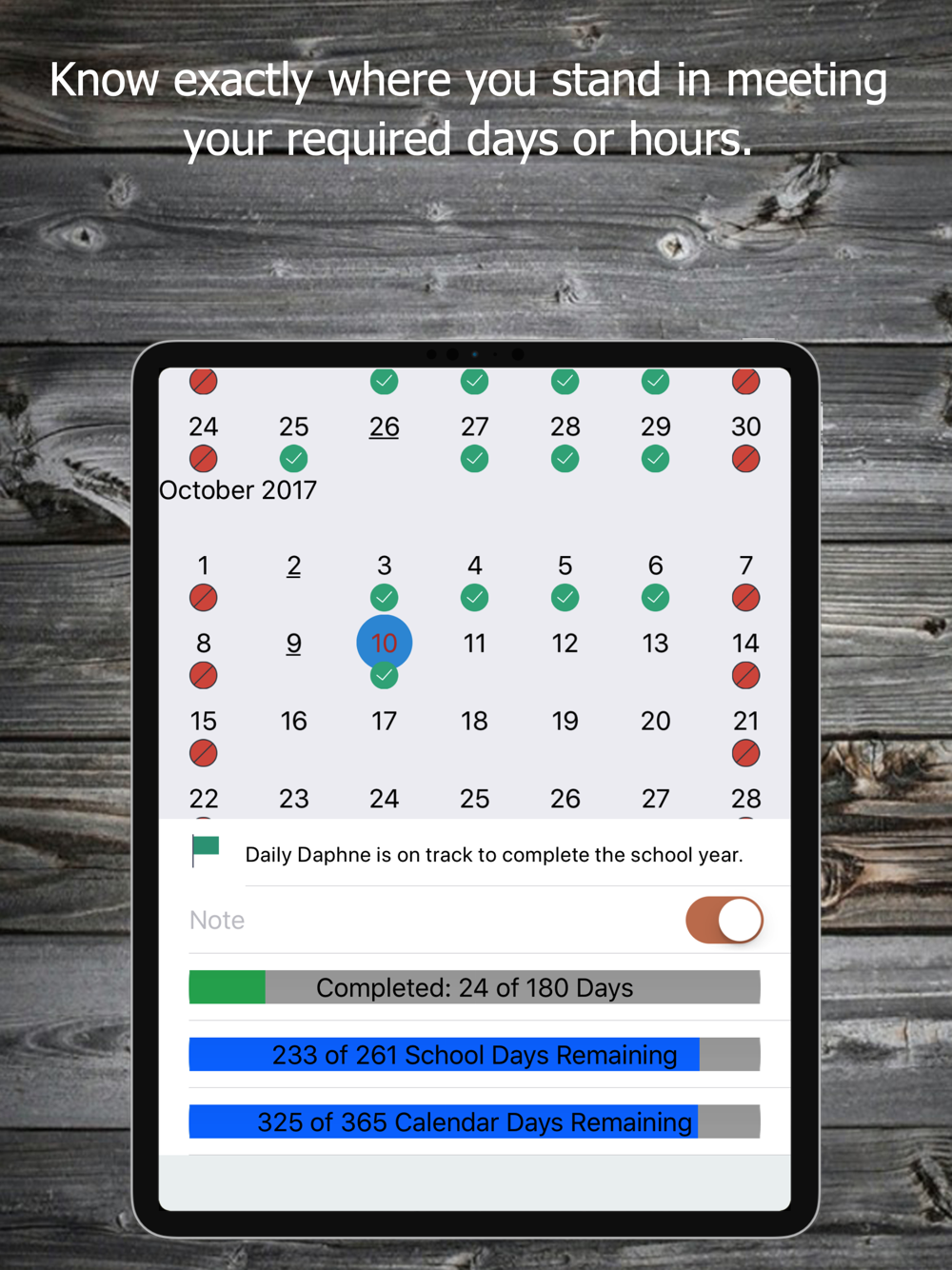 - Daily Attendance: You can track attendance on a daily basis. Set a target goal for the school year and Homeschool Attendance will tell you whether you're on track to reach it.