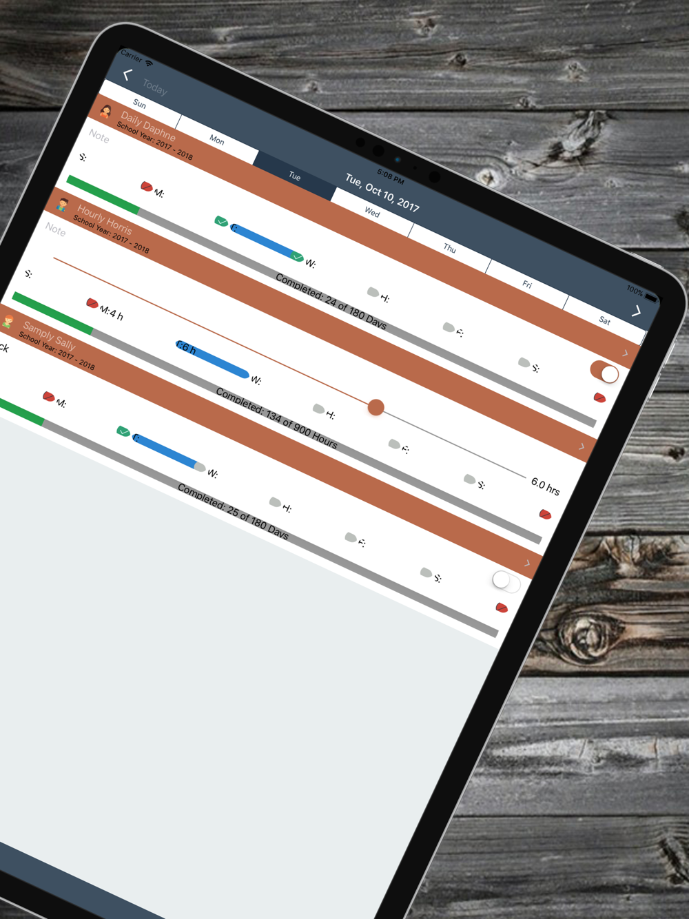 The main application shows a summary view of your weekly attendance at a glance. Tap on a student to get a detailed calendar view of their annual attendance.
