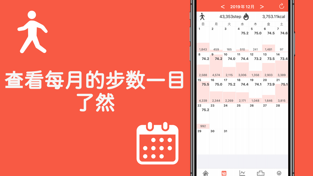 Stepy根据步数自动计算行走距离,燃烧的卡路里,步行时间。它可以与iPhone终端中的所有过去数据同步。一周前没有任何约束力。您也可以输入每个日期的体重,因此也建议用于饮食。