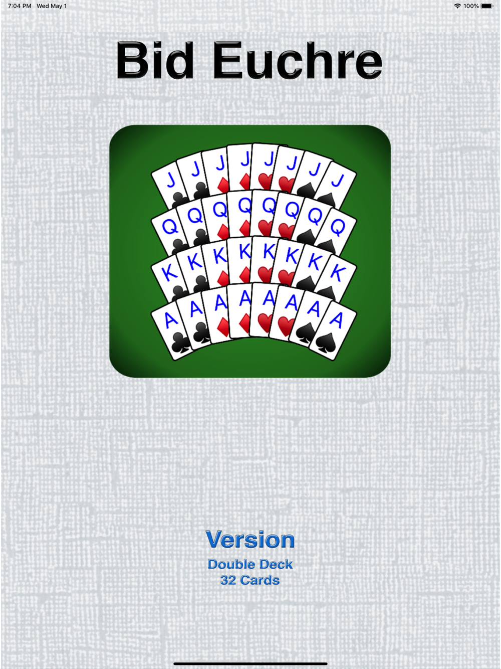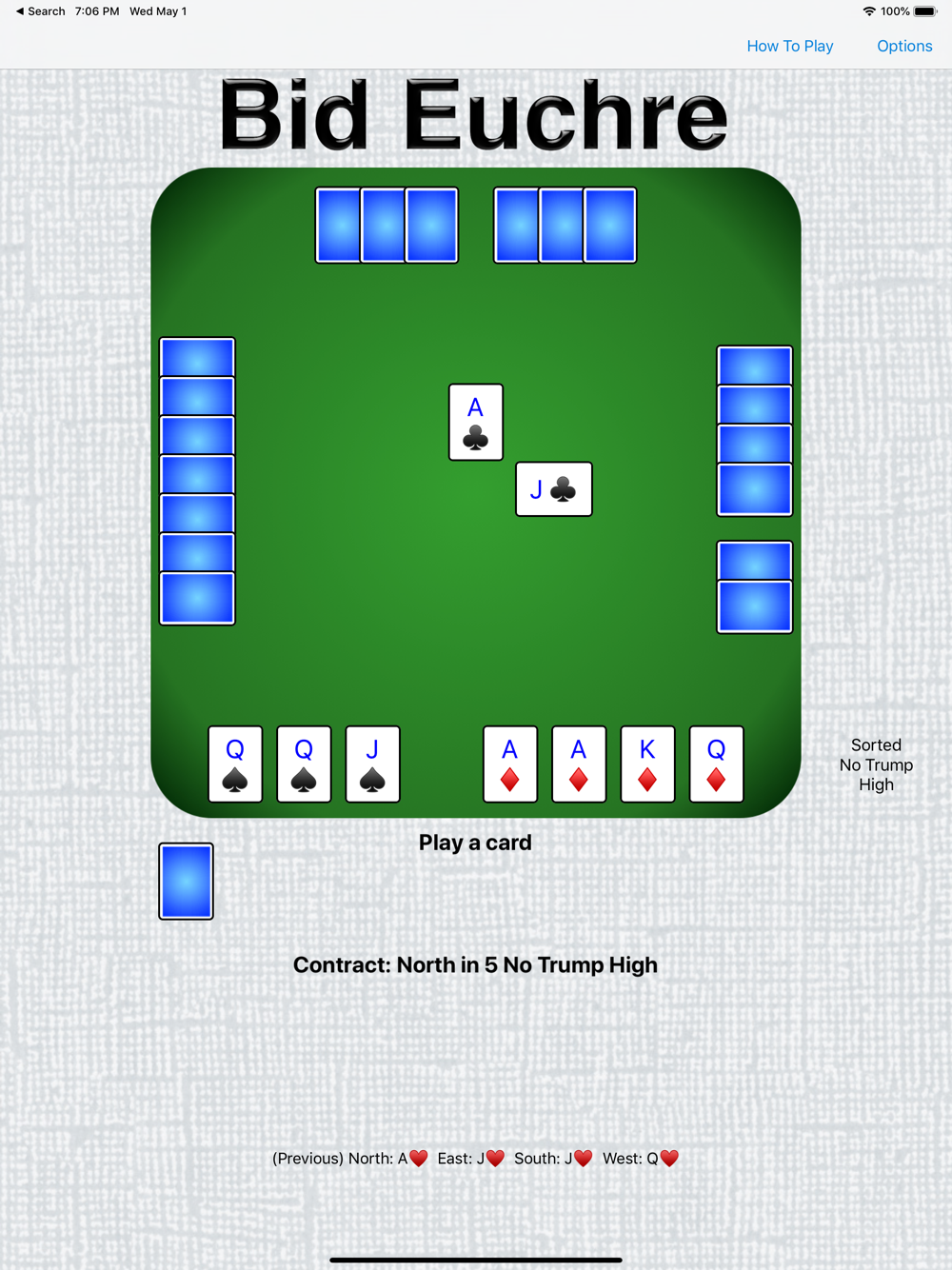 Play Bid Euchre against three A.I. participants. This solitaire game is the 32-card, double deck version. Instructions for playing and some bidding options are provided.