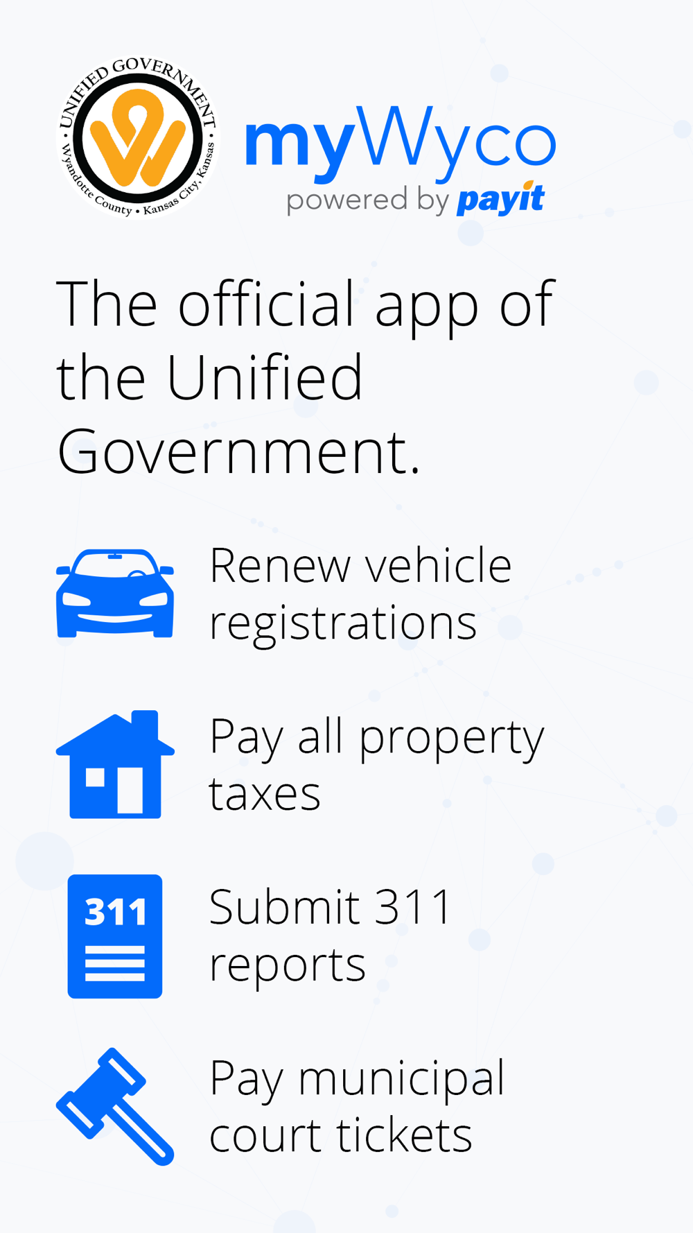myWyco is the official app of the Unified Government of Kansas City, Kansas and Wyandotte County. Introducing a friendlier, easier way to pay your property tax, report 311 issues, and renew your vehicle registration.