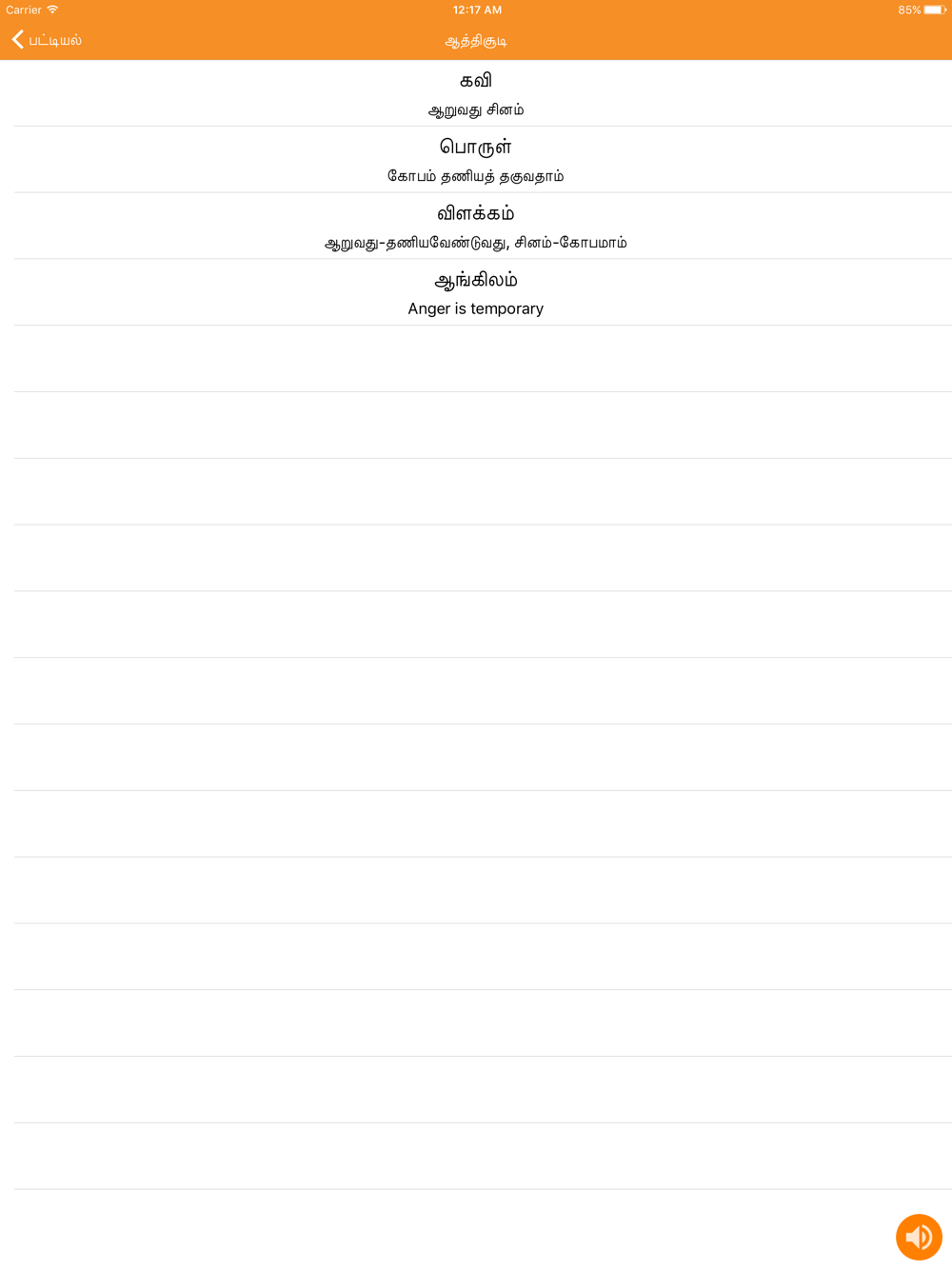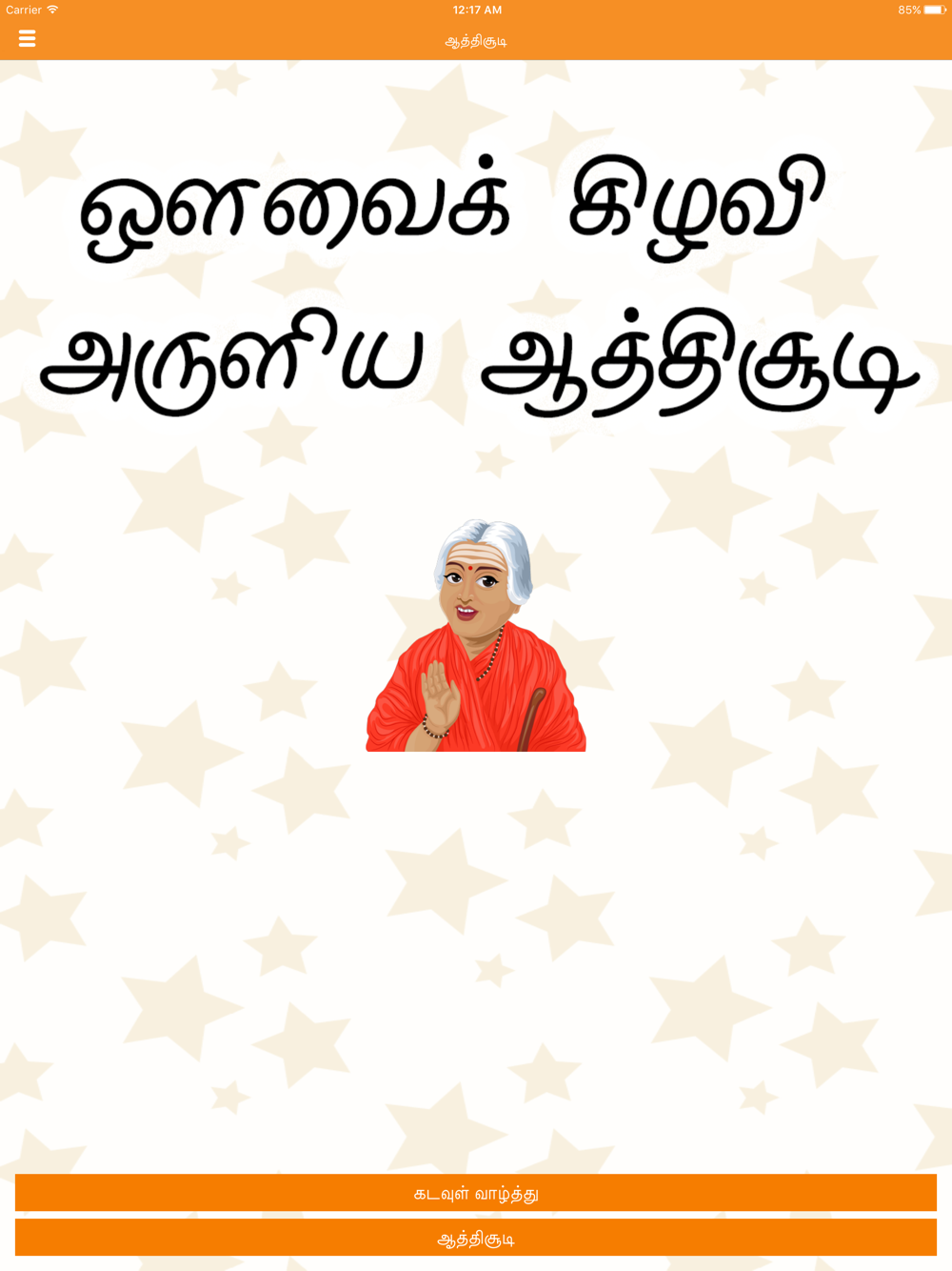 Aathichudi is 109 lines of maxims created by great old Tamil poet Auvaiyar. This app features all 109 lines of maxims with sound ( audio ) clips along. You can play and listen to each maxim via this app.