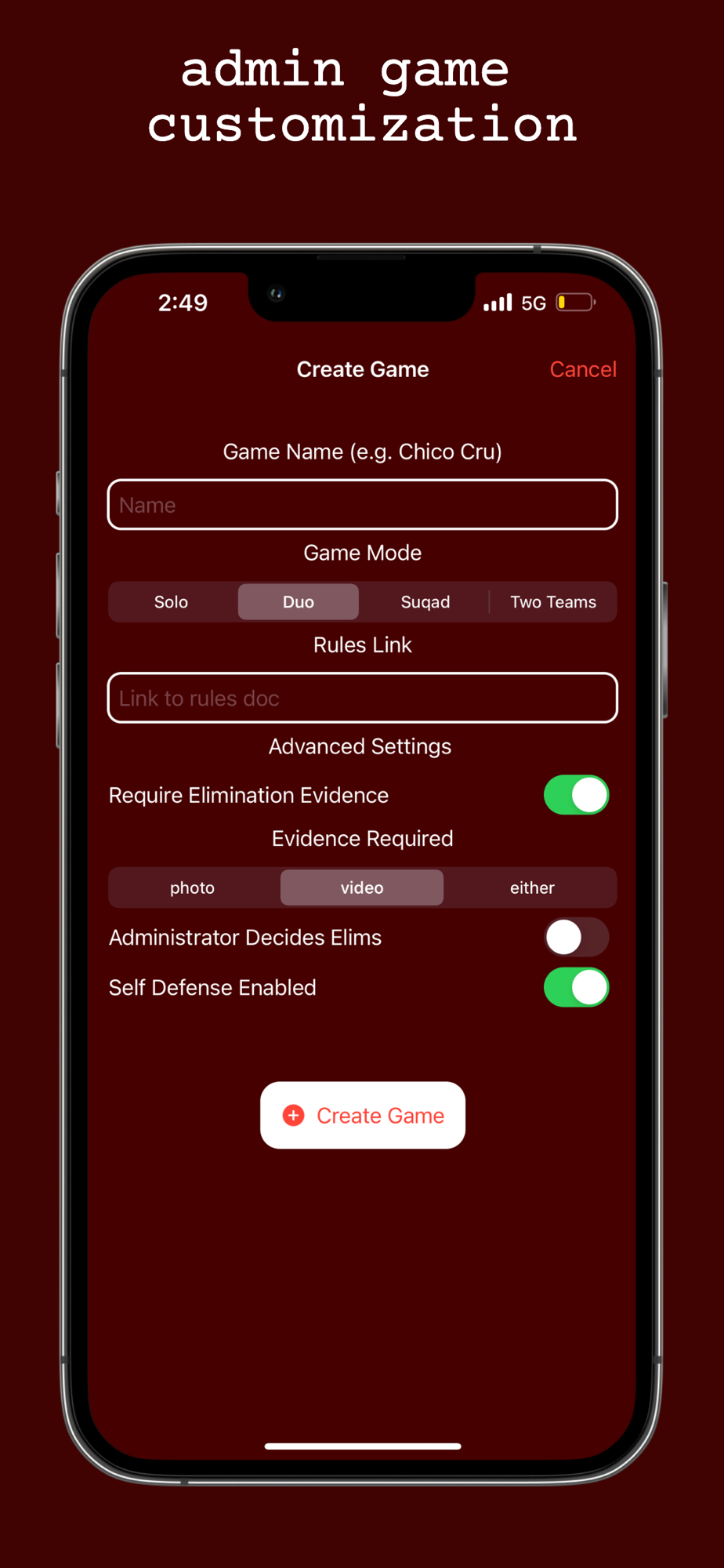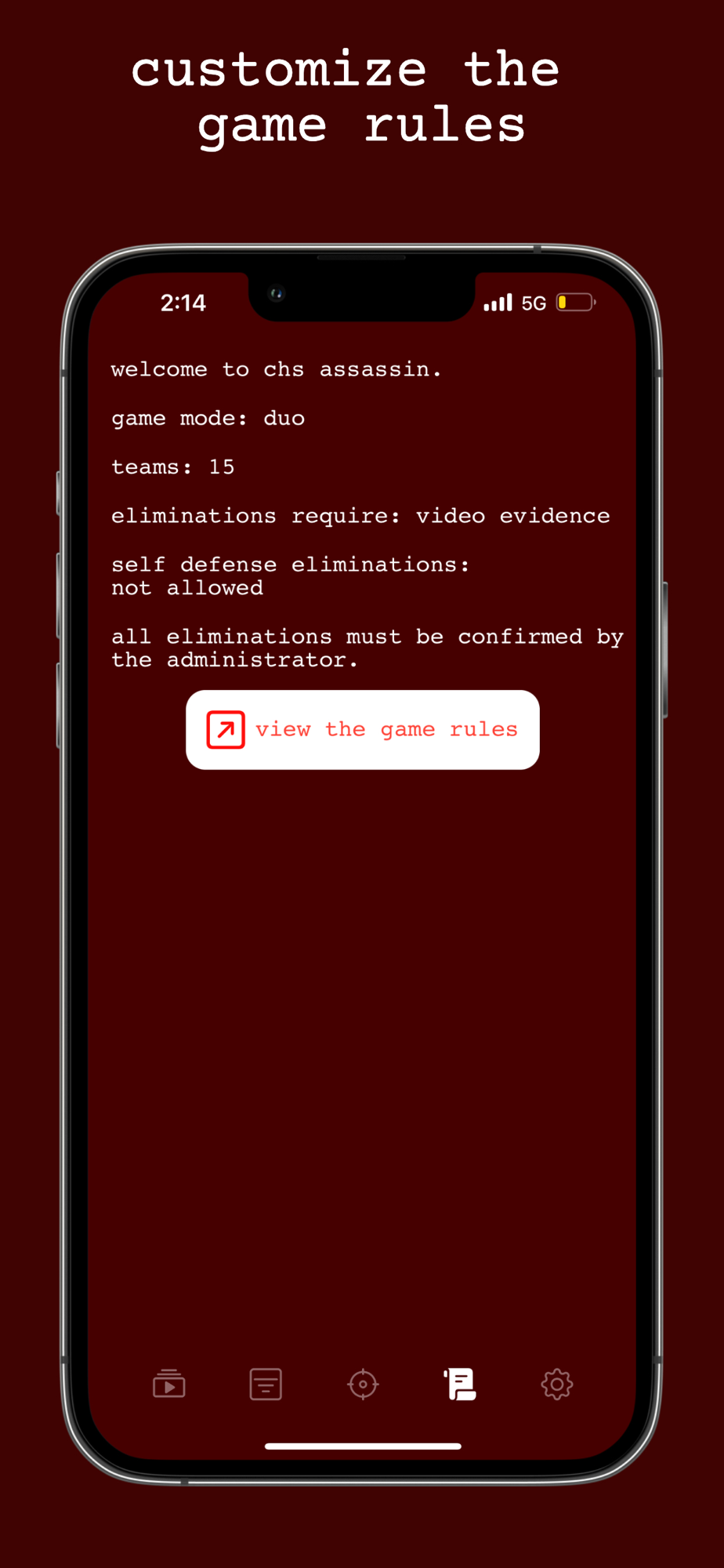 asssassin is a game to play with friends. Make a game with your own rules, get your target, and play! Race to be the last one standing by not getting eliminated!