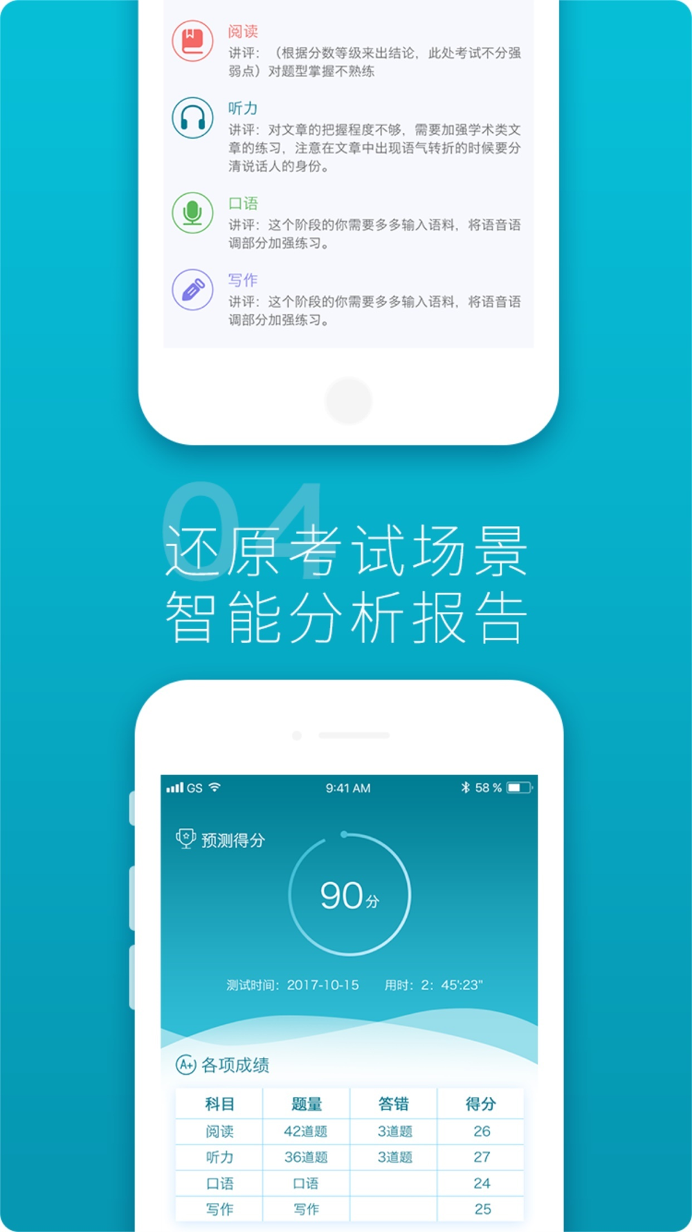 3.智能报告:覆盖听说读写全面测评结果,快速定位能力弱项,制定计划练习,快速提分。
