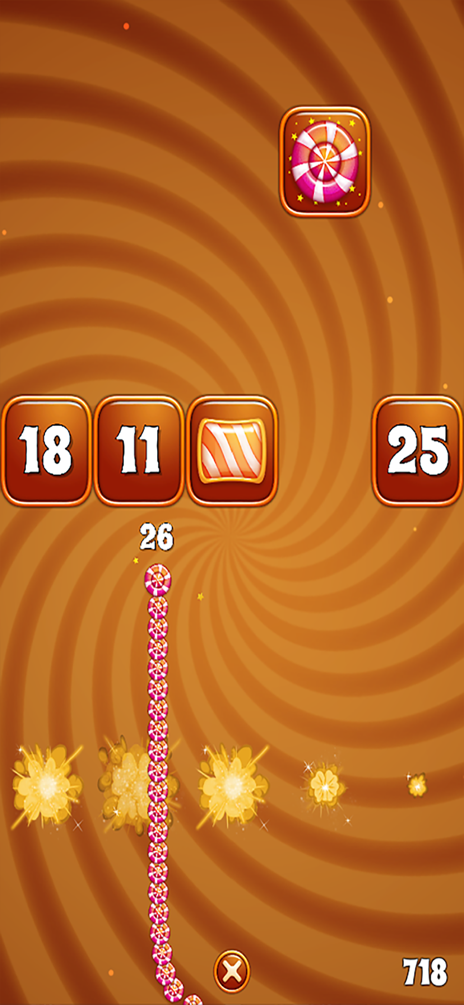 Slide your finger left and right to move the candy caterpillar. Collect candy pickups to add to the caterpillar's length, but try to avoid hitting the numbered blocks which will reduce the caterpillar's length. If your caterpillar runs out of segments, it’s Game Over! Hit the power-up blocks to speed up, destroy nearby blocks, or gain temporary invincibility!