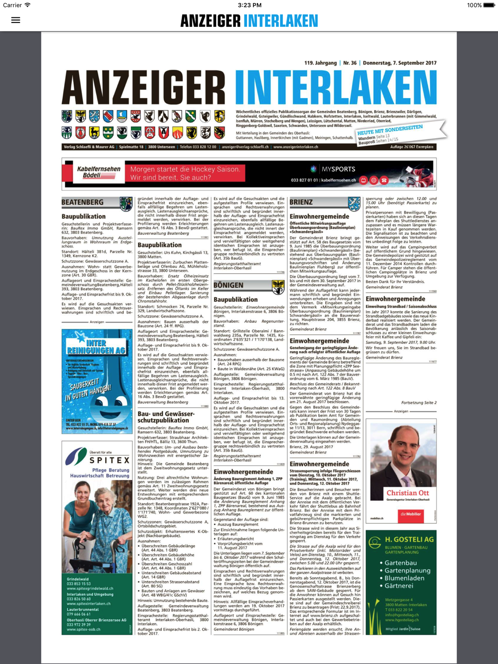 Im Anzeiger Interlaken finden Sie die amtlichen Gemeindemitteilungen von 23 Gemeinden im Verwaltungskreis Interlaken-Oberhasli, den aktuellen Stellen-, Liegenschafts- und Mietermarkt sowie den umfangreichsten Eventkalender im östlichen Berner Oberland.