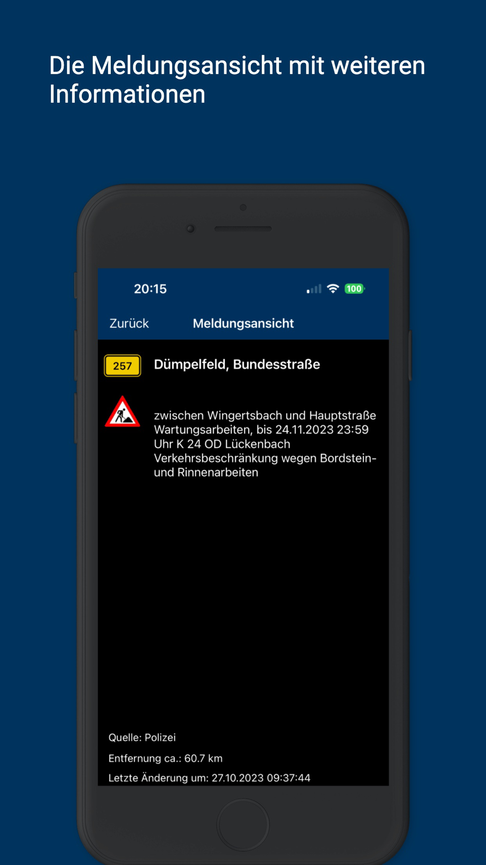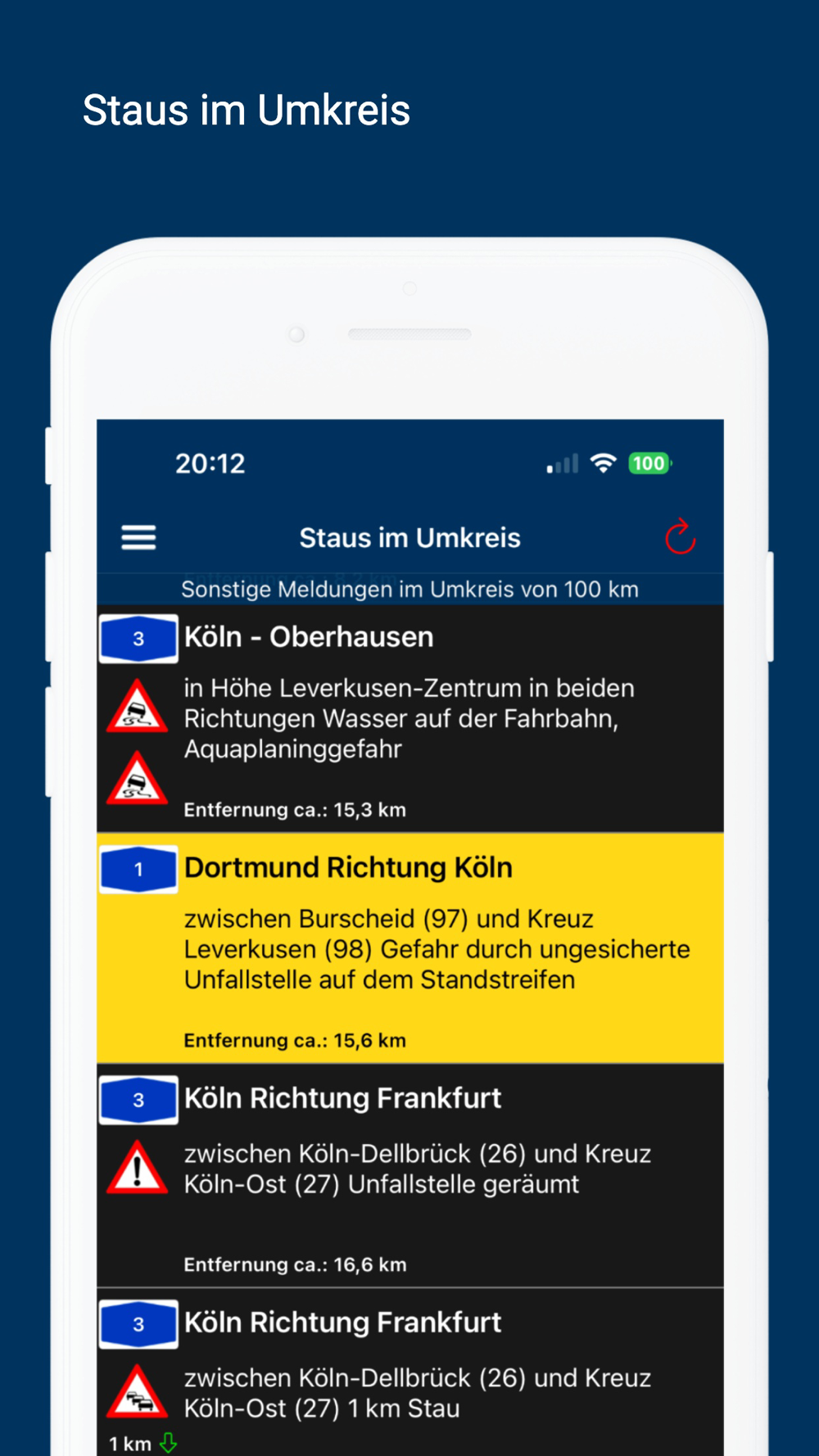 - Staumeldungen mit Tendenz, Datum der letzten Aktualisierung und farbliche Hervorhebung von Warn- und Falschfahrermeldungen