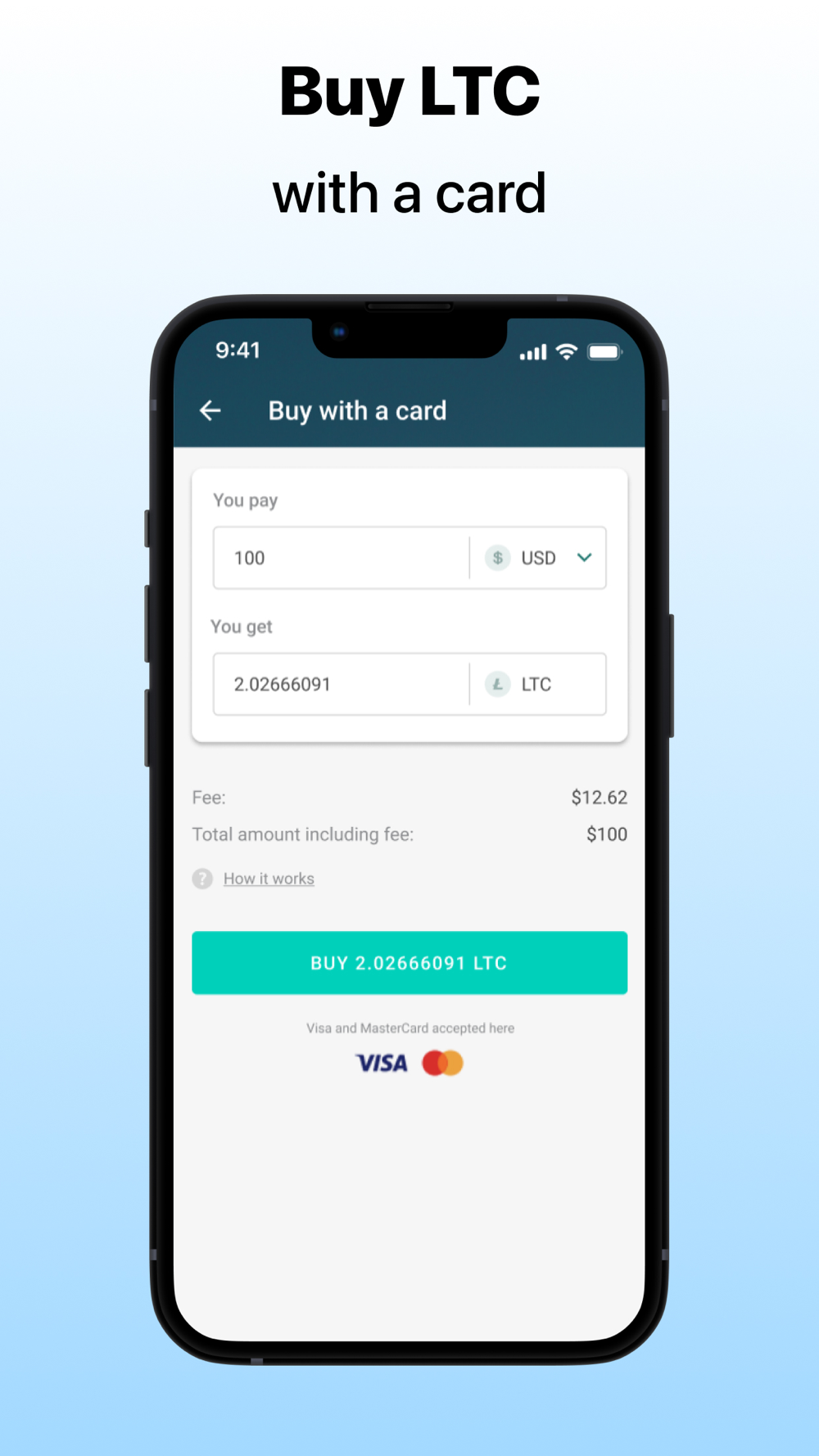 Don’t have any LTC, then buy it right in your mobile phone. You can pay with USD, EUR, GBP or other fiat currencies and get Litecoin instantly. We accept all major credit and debit cards (VISA, MasterCard, etc.) including pre-paid and virtual bank cards.