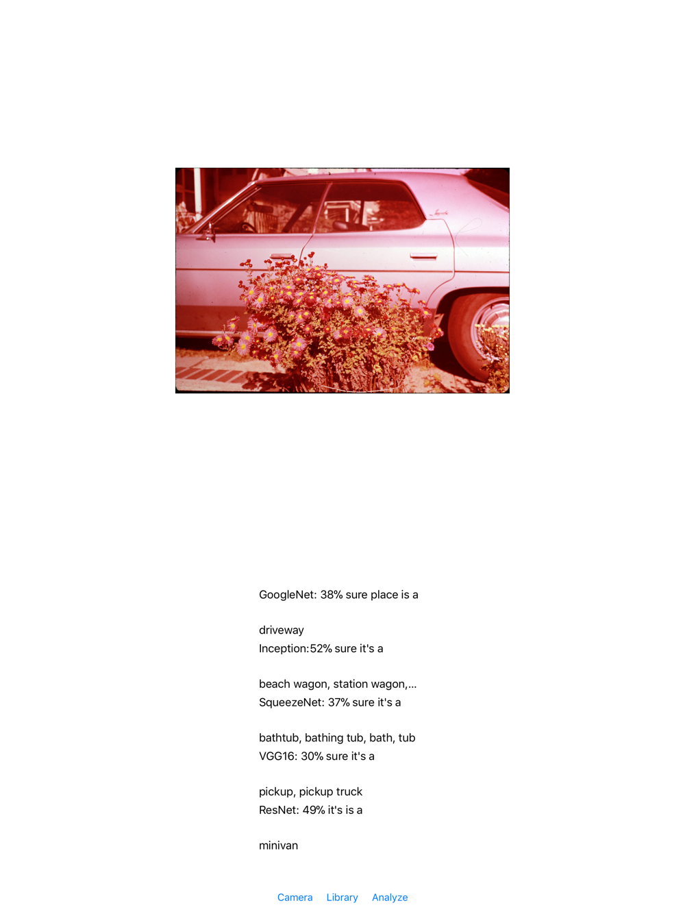 This great little App lets you use the camera or library to select a picture and then lets the iPhone or iPad analyze the picture with pre-trained Machine Learning models, ON THE PHONE! (in Airplane Mode) and not using the network to send the picture to a giant server in the sky.