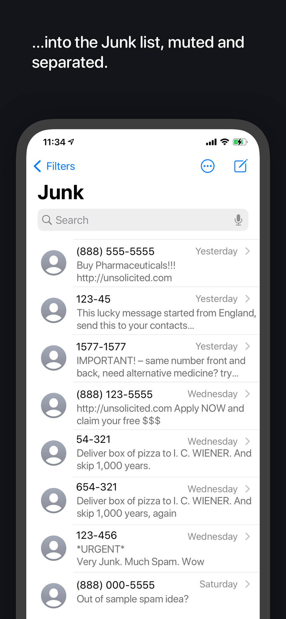 Filter SMS and MMS from unknown senders into a separate, muted list. SMS filter extension turns off notifications for SMS and MMS from people who are not in your Contacts.