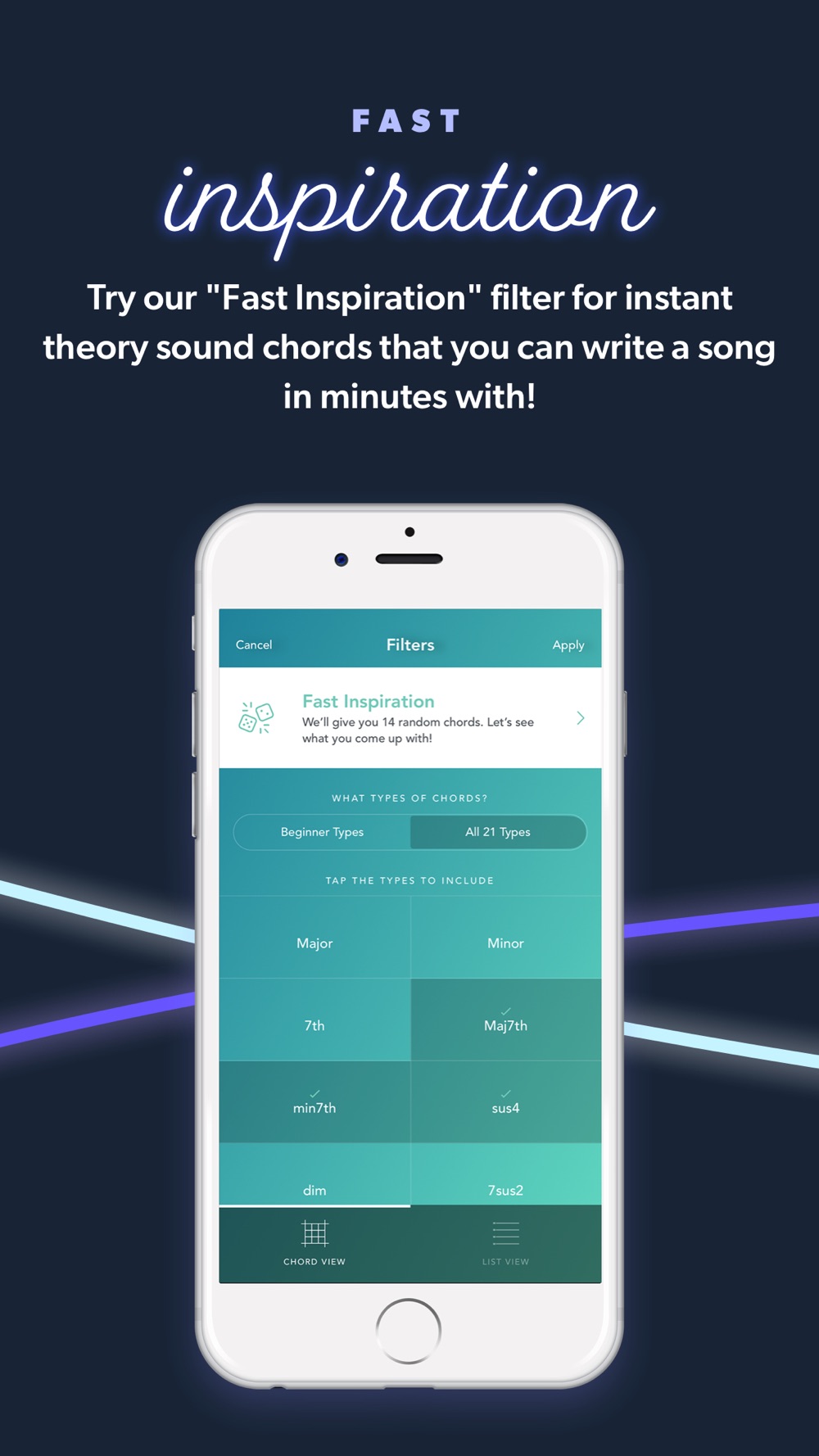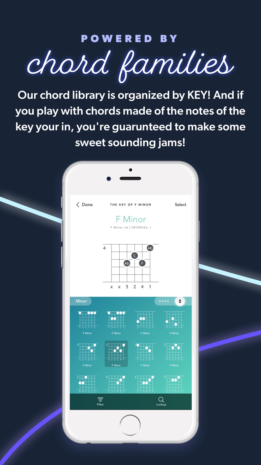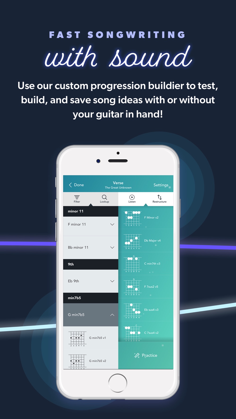 Basically the coolest most helpful guitar chord app ever, Song™ is built on top of a custom chord library organized by KEY that allows you to quickly & easily spark up new song ideas, giving you the songwriting power you deserve. With Song™ you don't even have to know any theory to start writing songs today!