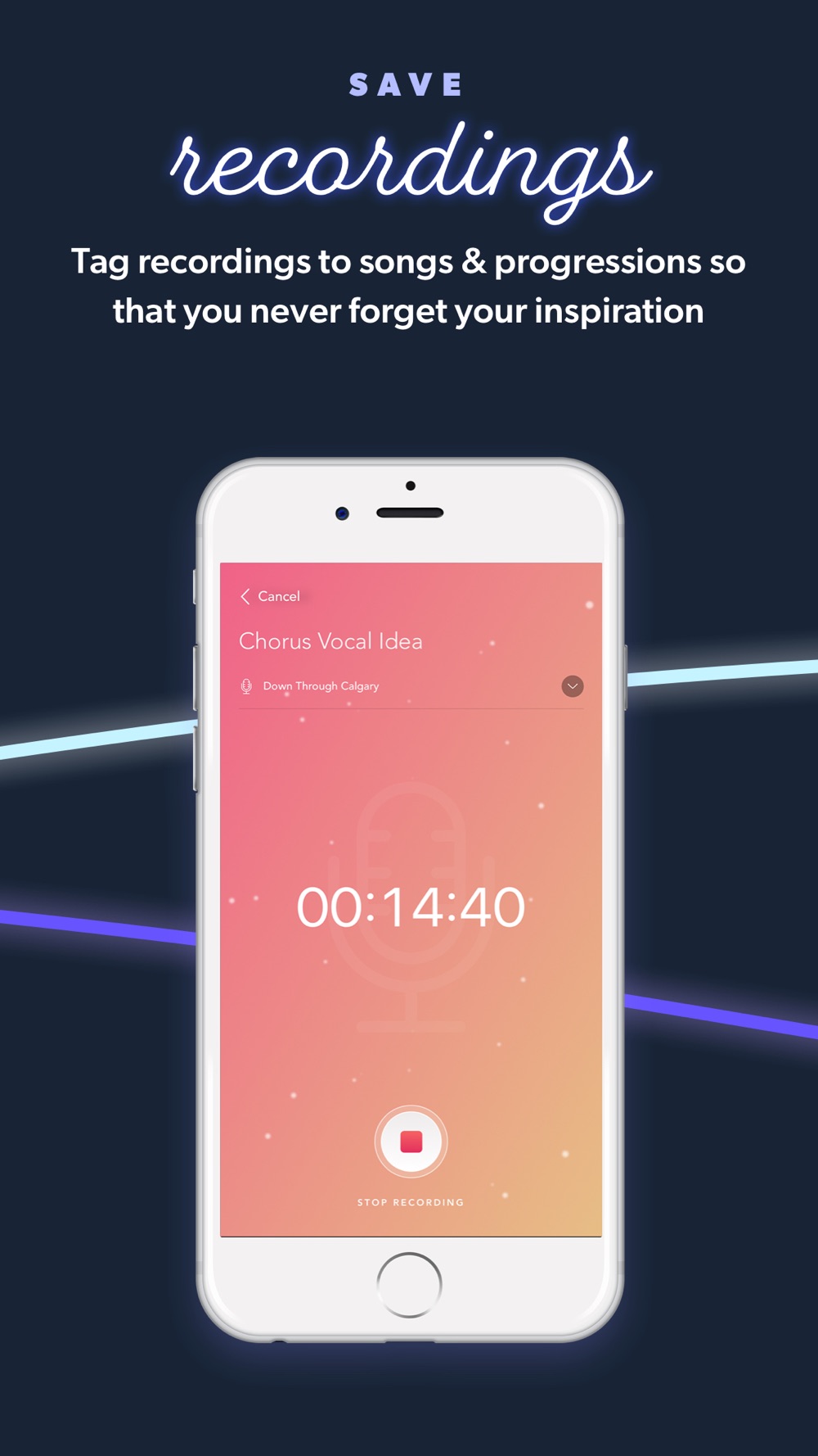 • Studio view that allows easy access for all of your songs, progressions, recordings, & notes.